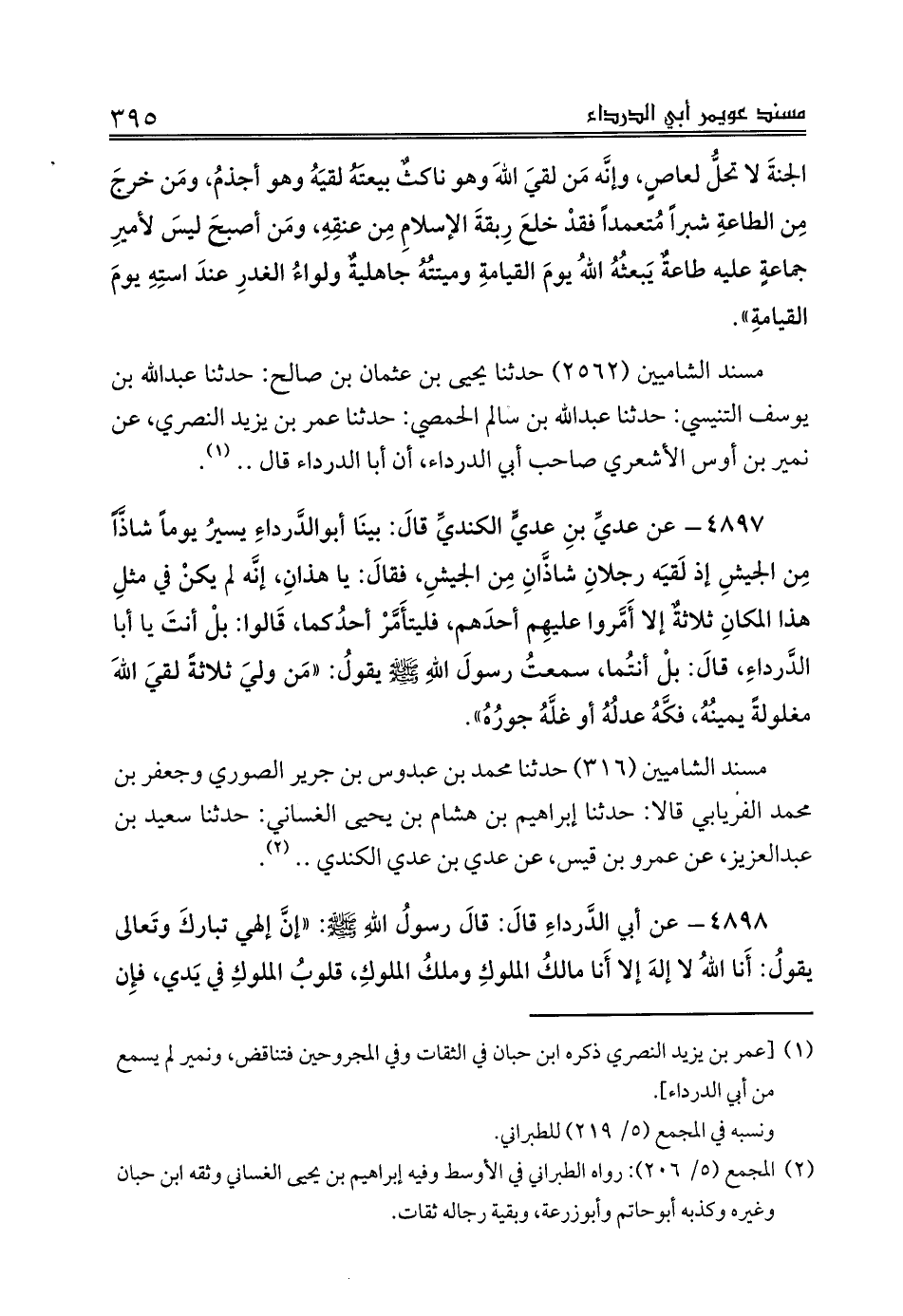 4897 - عن عديِّ بنِ عديٍّ الكنديِّ قالَ: بينَا أبوالدَّرداءِ يسيرُ يوماً شاذَّاً مِن الجيشِ إذ لَقيَه رجلانِ شاذَّانِ مِن الجيشِ، فقالَ: يا هذانِ، إنَّه لم يكنْ في مثلِ هذا المكانِ ثلاثةٌ إلا أَمَّروا عليهِم أحدَهم، فليتأَمَّرْ أحدُكما، قَالوا: بلْ أنتَ يا أبا الدَّرداءِ، قالَ: بلْ أنتُما، سمعتُ رسولَ اللهِ صلى الله عليه وسلم يقولُ: «مَن وليَ ثلاثةً لقيَ اللهَ مغلولةً يمينُهُ، فكَّهُ عدلُهُ أو غلَّهُ جورُهُ».