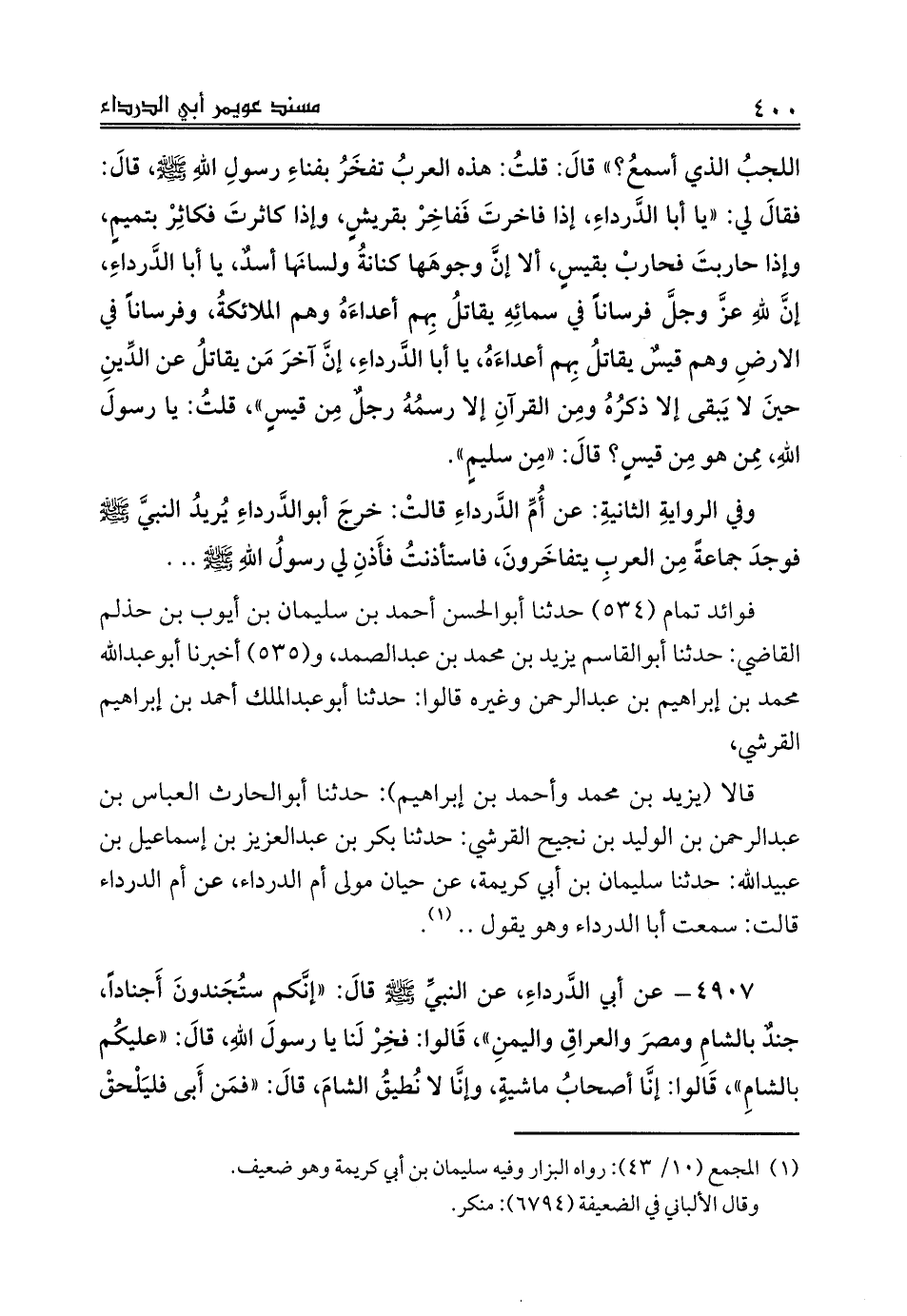 قالا (يزيد بن محمد وأحمد بن إبراهيم): حدثنا أبوالحارث العباس بن عبدالرحمن بن الوليد بن نجيح القرشي: حدثنا بكر بن عبدالعزيز بن إسماعيل بن عبيدالله: حدثنا سليمان بن أبي كريمة، عن حيان مولى أم الدرداء، عن أم الدرداء قالت: سمعت أبا الدرداء وهو يقول .. (¬1).