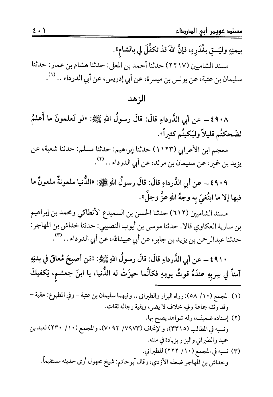 4908 - عن أبي الدَّرداءِ قالَ: قالَ رسولُ اللهِ صلى الله عليه وسلم: «لو تَعلمونَ ما أَعلمُ لضَحكتُم قليلاً ولبَكيتُم كثيراً».