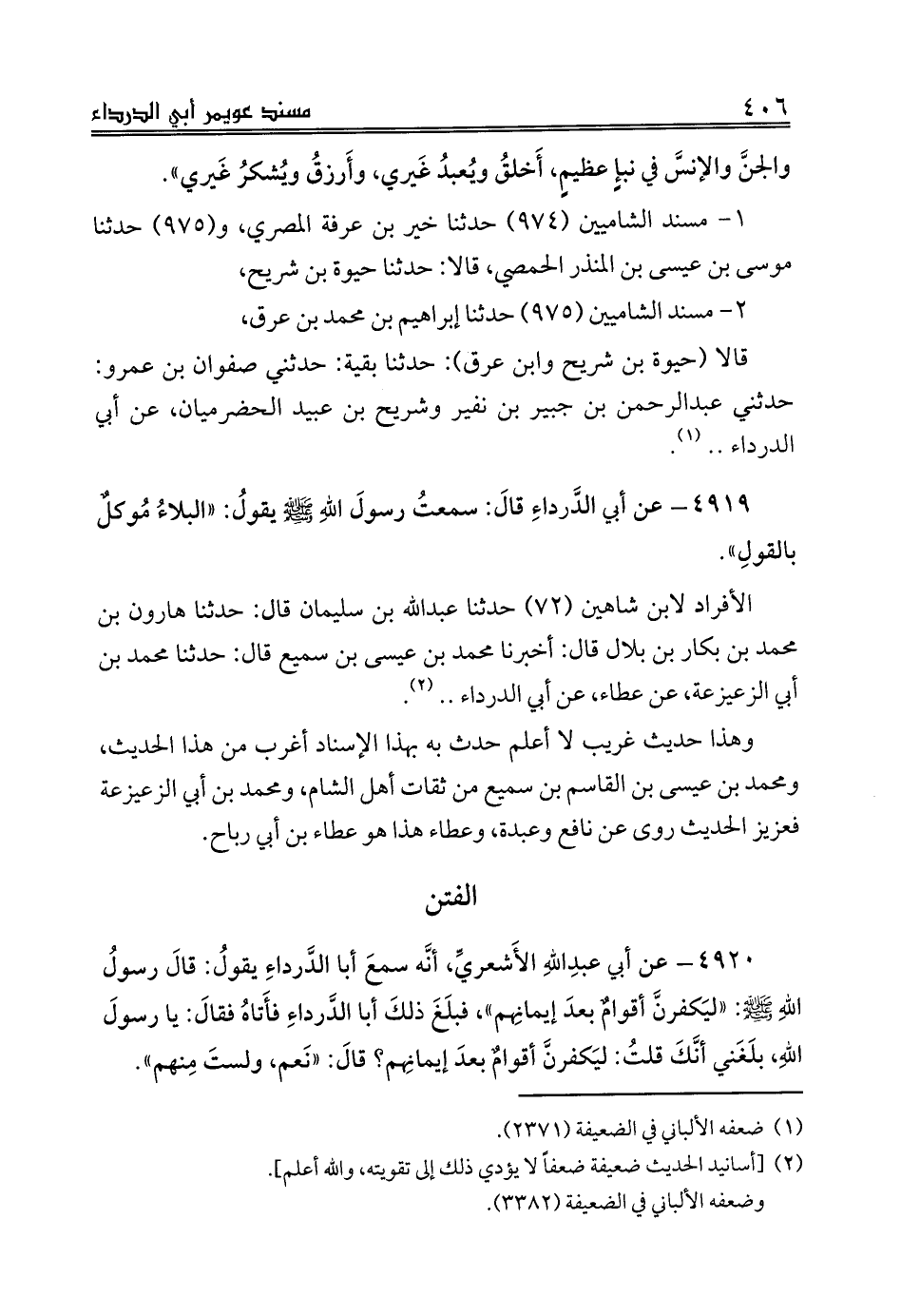 4920 - عن أبي عبدِاللهِ الأَشعريِّ، أنَّه سمعَ أبا الدَّرداءِ يقولُ: قالَ رسولُ اللهِ صلى الله عليه وسلم: «ليَكفرنَّ أقوامٌ بعدَ إيمانِهم»، فبلَغَ ذلكَ أبا الدَّرداءِ فأَتاهُ فقالَ: يا رسولَ اللهِ، بلَغَني أنَّكَ قلتُ: ليَكفرنَّ أقوامٌ بعدَ إيمانِهم؟ قالَ: «نَعم، ولستَ مِنهم».