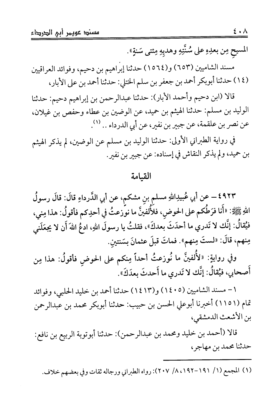 4923 - عن أبي عُبيدِ اللهِ مسلمِ بنِ مشكمٍ، عن أبي الدَّرداءِ قالَ: قالَ رسولُ اللهِ صلى الله عليه وسلم: «أَنا فرَطُكم على الحوضِ، فلأُلفينَّ ما نوزعتُ في أحدِكم فأقولُ: هذا مِني، فيُقالُ: إنَّك لا تَدري ما أحدَثَ بعدكَ»، فقلتُ يا رسولَ اللهِ، ادعُ اللهَ أَن لا يجعَلَني مِنهم، قالَ: «لستَ مِنهم». فماتَ قبلَ عثمانَ بسَنتينِ.