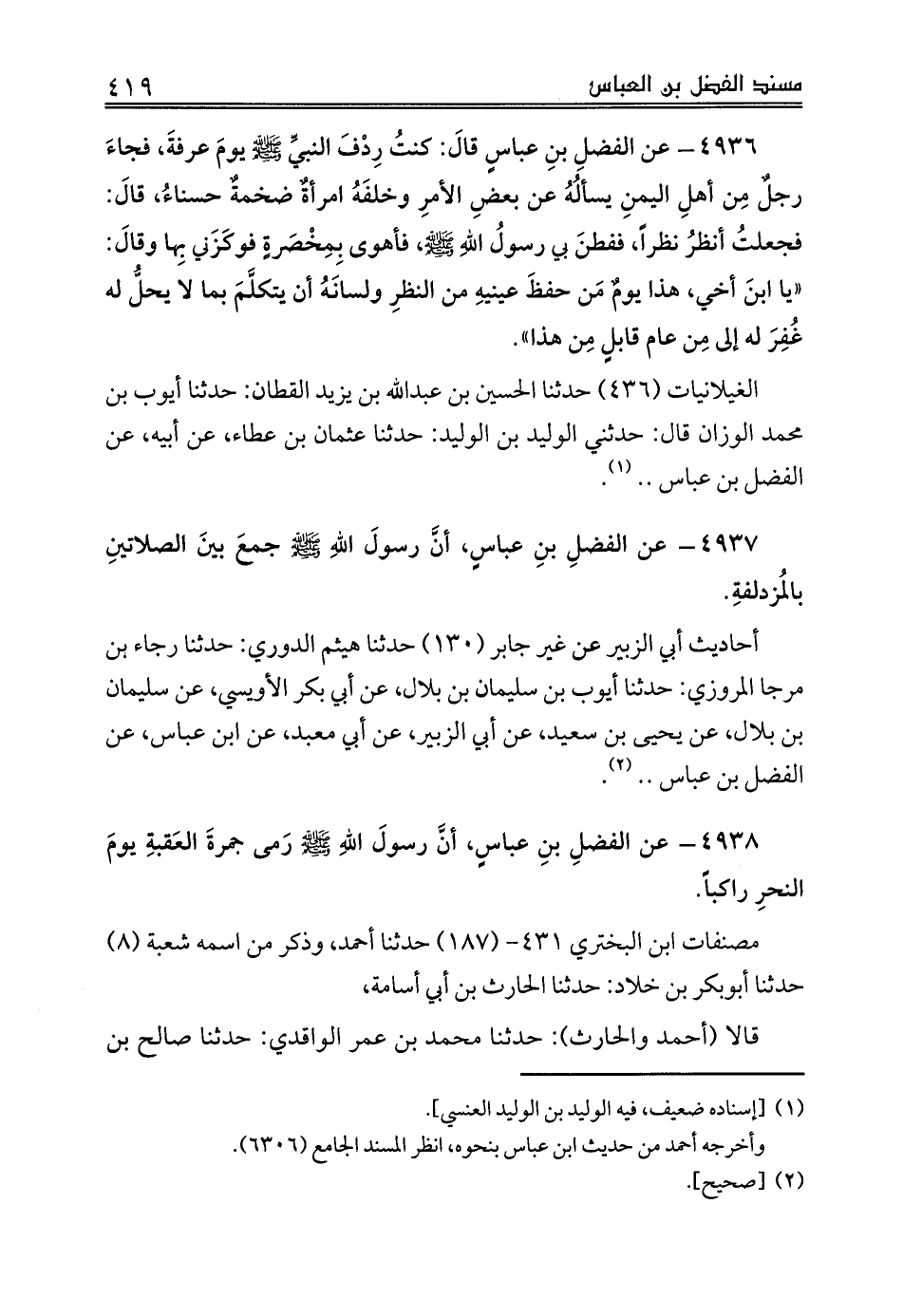 4936 - عن الفضلِ بنِ عباسٍ قالَ: كنتُ رِدْفَ النبيِّ صلى الله عليه وسلم يومَ عرفةَ، فجاءَ رجلٌ مِن أهلِ اليمنِ يسألُهُ عن بعضِ الأمرِ وخلفَهُ امرأةٌ ضخمةٌ حسناءُ، قالَ: فجعلتُ أنظرُ نظراً، ففطنَ بي رسولُ اللهِ صلى الله عليه وسلم، فأهوى بِمِخْصَرةٍ فوكَزَني بِها وقالَ: «يا ابنَ أخي، هذا يومٌ مَن حفظَ عينيهِ من النظرِ ولسانَهُ أن يتكلَّمَ بما لا يحلُّ له غُفِرَ له إلى مِن عام قابلٍ مِن هذا».