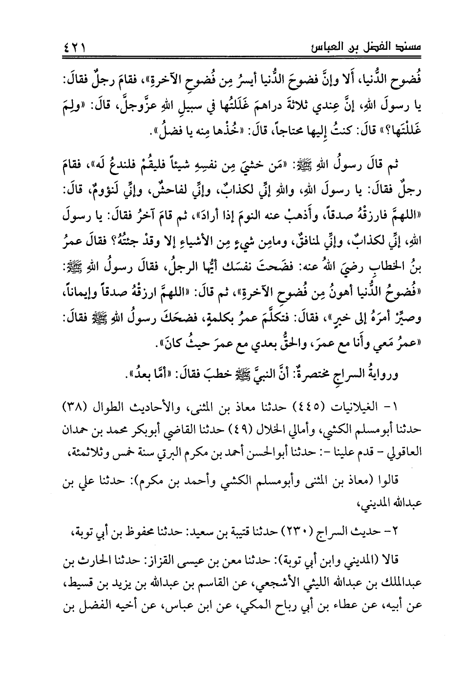 قالا (المديني وابن أبي توبة): حدثنا معن بن عيسى القزاز: حدثنا الحارث بن عبدالملك بن عبدالله الليثي الأشجعي، عن القاسم بن عبدالله بن يزيد بن قسيط، عن أبيه، عن عطاء بن أبي رباح المكي، عن ابن عباس، عن أخيه الفضل بن