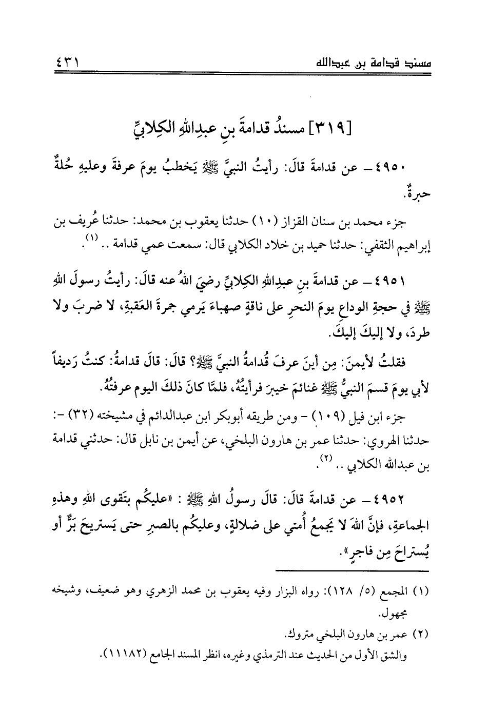 [319] مسندُ قدامةَ بنِ عبدِاللهِ الكِلابيِّ