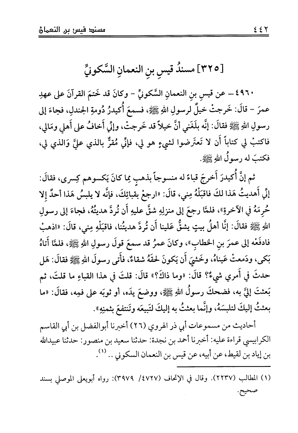 4960 - عن قيسِ بنِ النعمانِ السَّكونيِّ - وكانَ قد خَتمَ القرآنَ على عهدِ عمرَ - قالَ: خَرجتْ خيلٌ لرسولِ اللهِ صلى الله عليه وسلم، فسمعَ أُكيدرُ دُومةِ الجندلِ، فجاءَ إلى رسولِ اللهِ صلى الله عليه وسلم فقالَ: إنَّه بلَغَني أنَّ خيلاً قد خَرجتْ، وإنِّي أَخافُ على أَهلي ومَالي، فاكتبْ لي كتاباً أَن لا تَعتَرضوا لشيءٍ هو لي، فإنِّي مُقرٌّ بالذي عليَّ وَالذي لي، فكتبَ له رسولُ اللهِ صلى الله عليه وسلم.