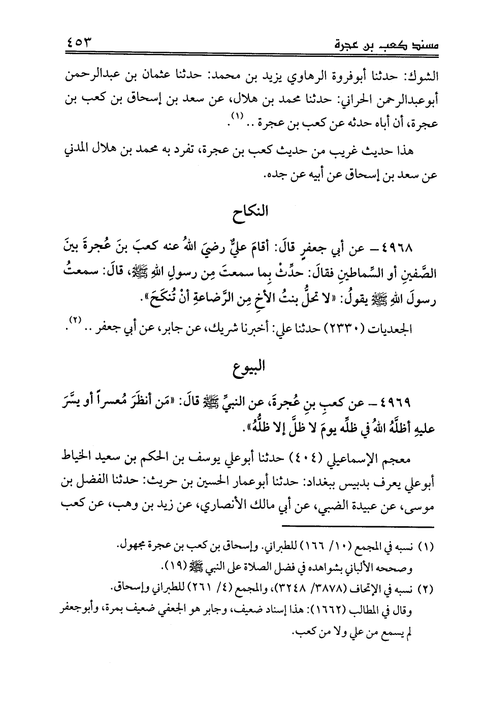 الشوك: حدثنا أبوفروة الرهاوي يزيد بن محمد: حدثنا عثمان بن عبدالرحمن أبوعبدالرحمن الحراني: حدثنا محمد بن هلال، عن سعد بن إسحاق بن كعب بن عجرة، أن أباه حدثه عن كعب بن عجرة .. (¬1).