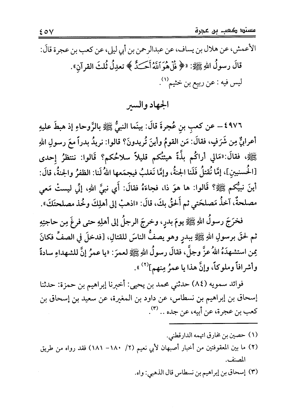 4976 - عن كعبِ بنِ عُجرةَ قالَ: بينَما النبيُّ صلى الله عليه وسلم بالرَّوحاءِ إذ هبطَ عليهِ أعرابيٌّ مِن شَرَفٍ، فقالَ: مَن القومُ وأينَ تُريدونَ؟ قالوا: نريدُ بدراً معَ رسولِ اللهِ صلى الله عليه وسلم، فقالَ: «مَالي أراكُم بذَّةً هيئتُكم قليلاً سلاحُكم؟ قَالوا: ننتظرُ إِحدى [الحُسنيينِ]، إمَّا نُقتلُ فَلَنا الجنةُ، وإمَّا نَغلبُ فيجمَعها اللهُ لَنا: الظفرُ والجنةُ، قالَ: أينَ نبيُّكم صلى الله عليه وسلم؟ قَالوا: ها هوَذا، فجاءَهُ فقالَ: أَي نبيَّ اللهِ، إنِّي ليستْ مَعي مصلحةٌ، آخذُ مَصلحَتي ثم أَلحقُ بكَ، قالَ: «اذهبْ إلى أهلِكَ وخُذ مصلحتَكَ».