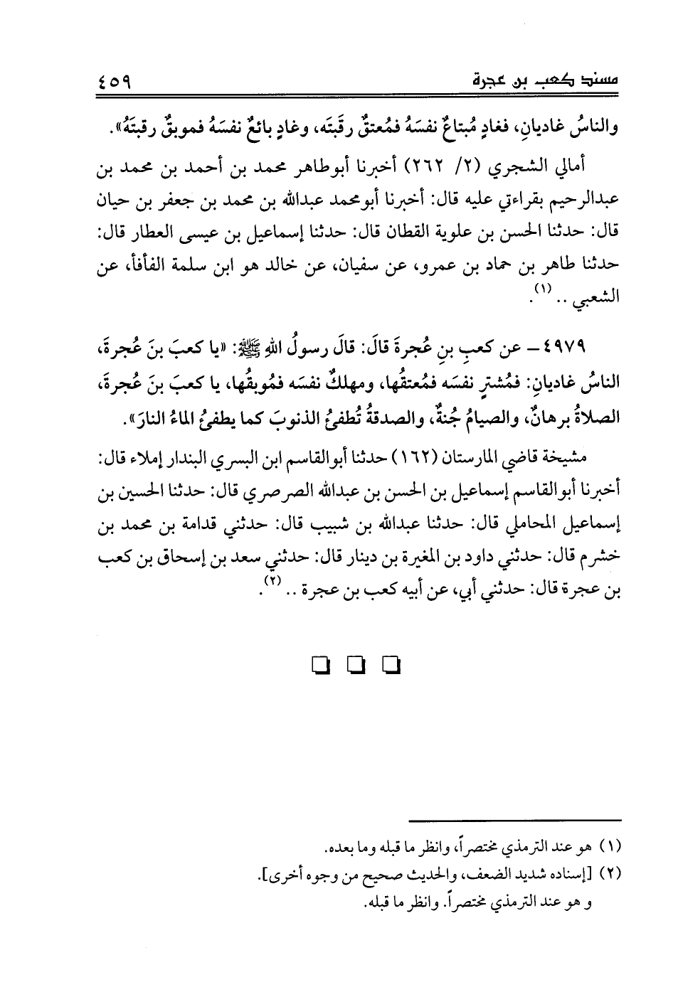 4979 - عن كعبِ بنِ عُجرةَ قالَ: قالَ رسولُ اللهِ صلى الله عليه وسلم: «يا كعبَ بنَ عُجرةَ، الناسُ غاديانِ: فمُشترٍ نفسَه فمُعتقُها، ومهلكٌ نفسَه فمُوبقُها، يا كعبَ بنَ عُجرةَ، الصلاةُ برهانٌ، والصيامُ جُنةٌ، والصدقةُ تُطفئُ الذنوبَ كما يطفئُ الماءُ النارَ».