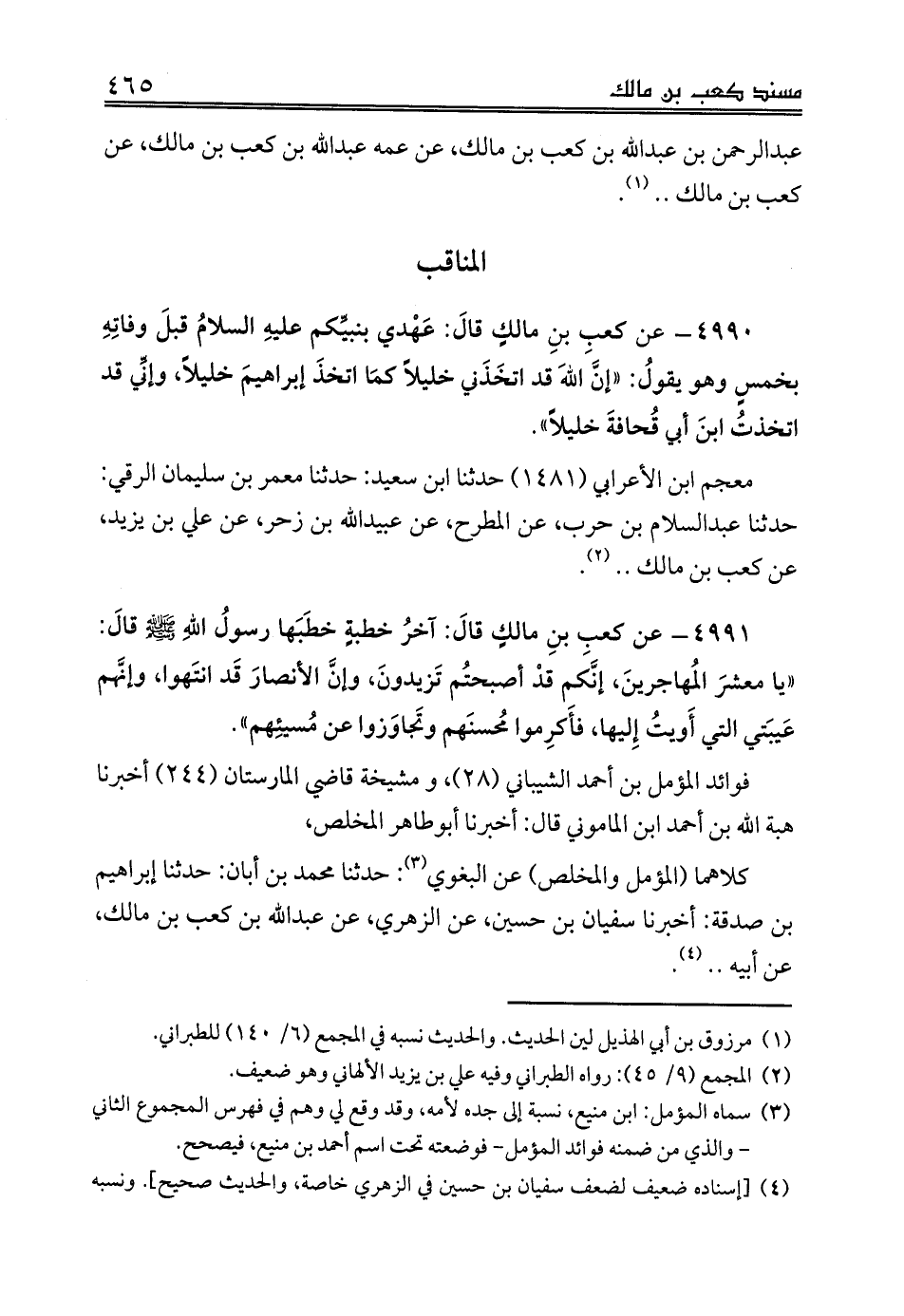 4990 - عن كعبِ بنِ مالكٍ قالَ: عَهْدي بنبيِّكم عليهِ السلامُ قبلَ وفاتِهِ بخمسٍ وهو يقولُ: «إنَّ اللهَ قد اتخَذَني خليلاً كمَا اتخذَ إبراهيمَ خليلاً، وإنِّي قد اتخذتُ ابنَ أبي قُحافةَ خليلاً».