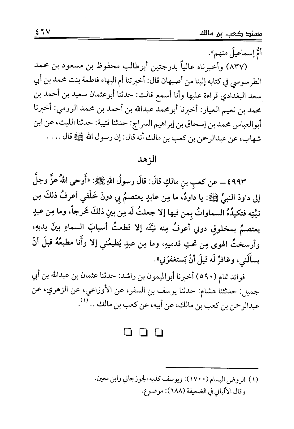 فوائد تمام (590) أخبرنا أبوالميمون بن راشد: حدثنا عثمان بن عبدالله بن أبي جميل: حدثثنا هشام: حدثنا يوسف بن السفر، عن الأوزاعي، عن الزهري، عن عبدالرحمن بن كعب بن مالك، عن أبيه، عن كعب بن مالك .. (¬1).
