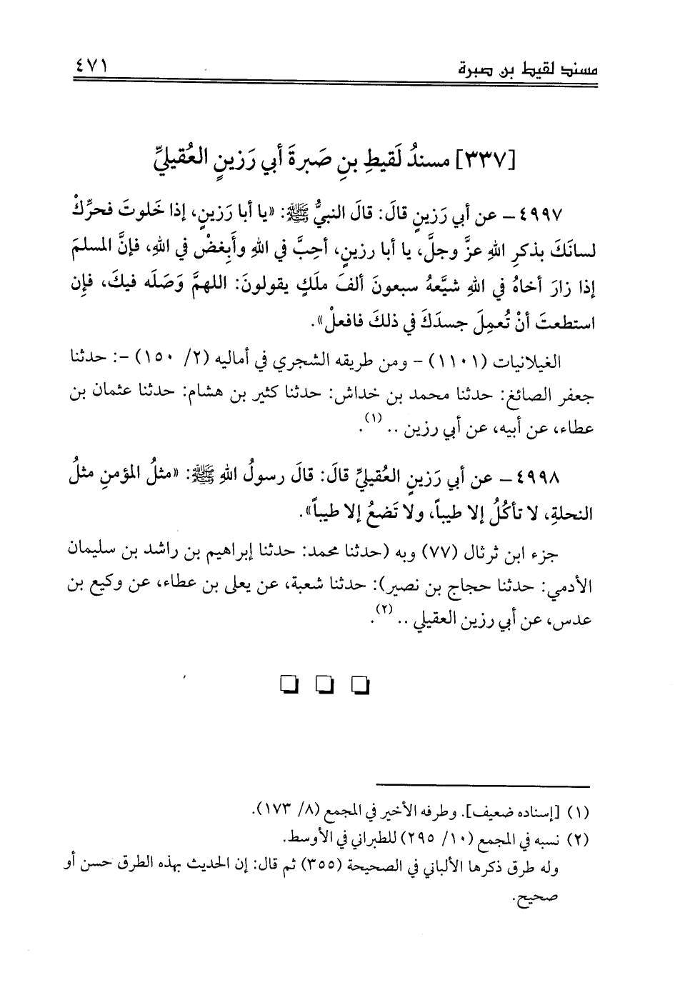 [337] مسندُ لَقيطِ بنِ صَبرةَ أبي رَزينٍ العُقيليِّ