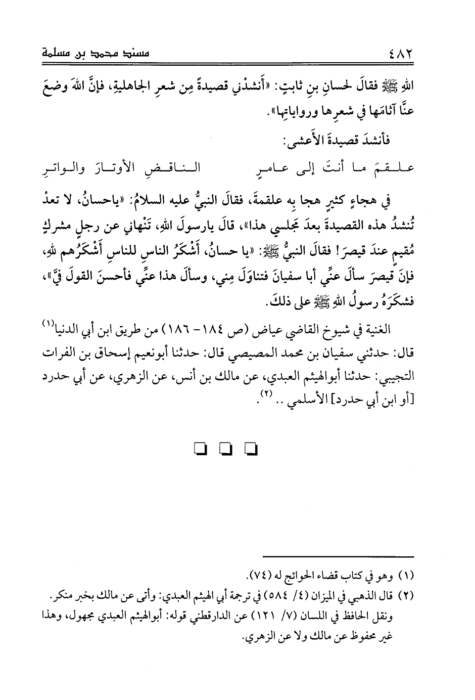 اللهِ صلى الله عليه وسلم فقالَ لحسانِ بنِ ثابتٍ: «أَنشدْني قصيدةً مِن شعرِ الجاهليةِ، فإنَّ اللهَ وضعَ عنَّا آثامَها في شعرِها ورواياتِها».