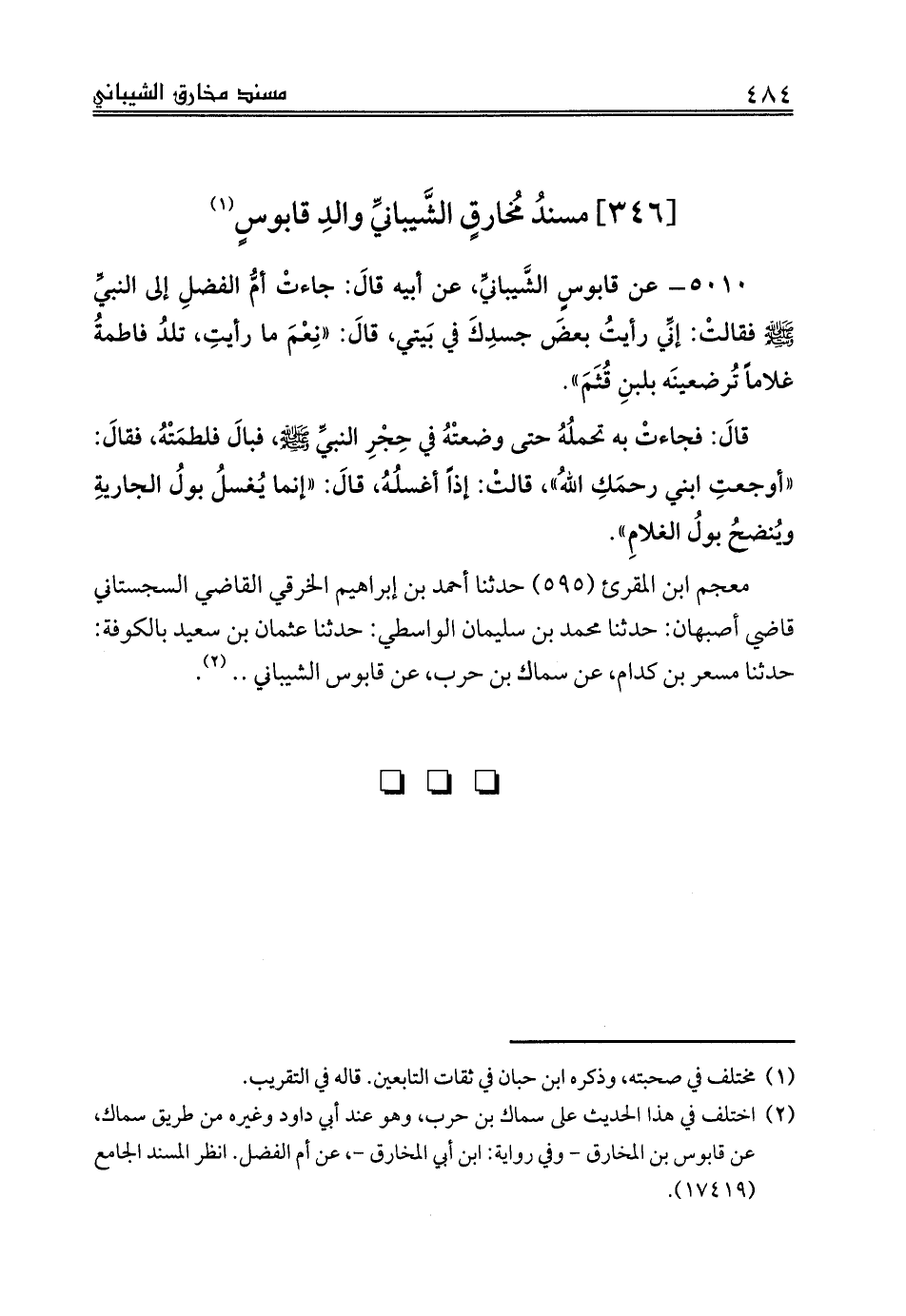 (¬2) اختلف في هذا الحديث على سماك بن حرب، وهو عند أبي داود وغيره من طريق سماك، عن قابوس بن المخارق - وفي رواية: ابن أبي المخارق -، عن أم الفضل. انظر المسند الجامع (17419).