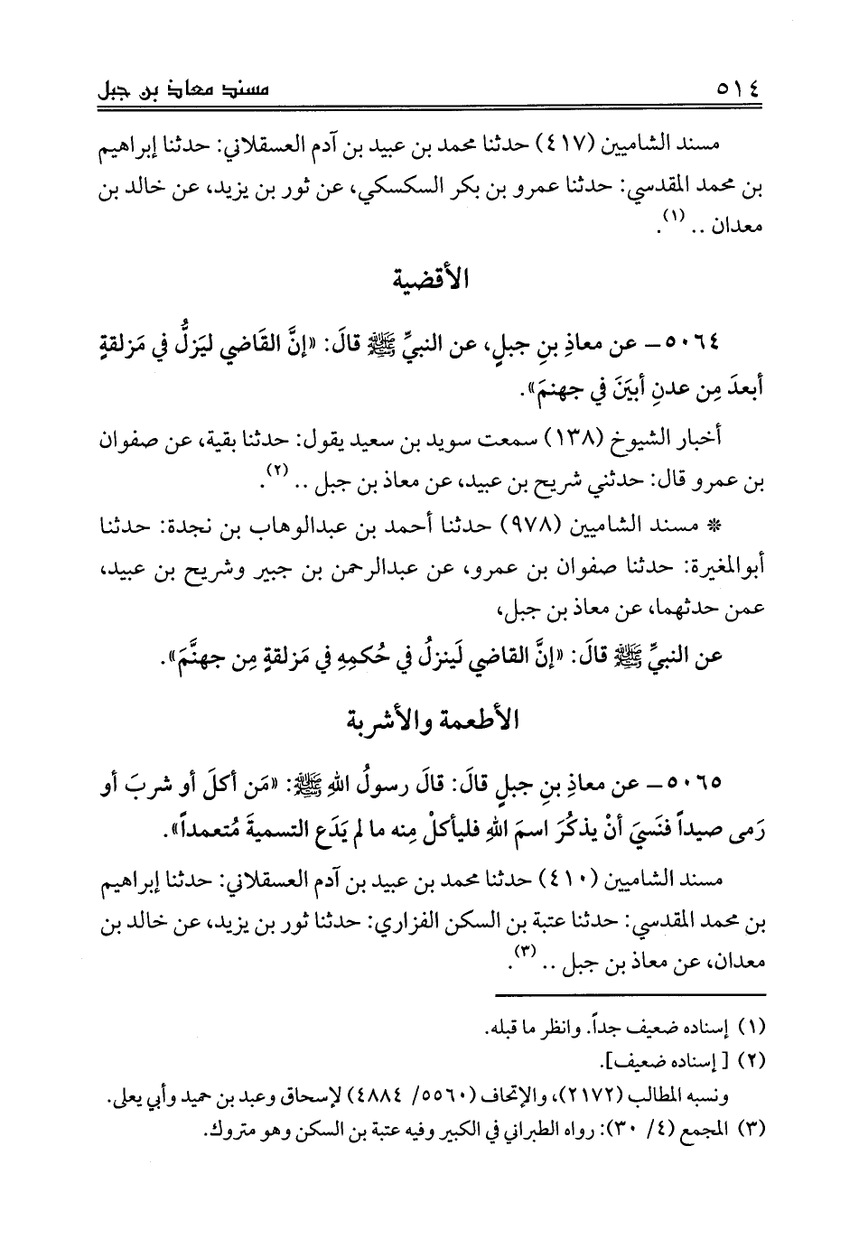 مسند الشاميين (410) حدثنا محمد بن عبيد بن آدم العسقلاني: حدثنا إبراهيم بن محمد المقدسي: حدثنا عتبة بن السكن الفزاري: حدثنا ثور بن يزيد، عن خالد بن معدان، عن معاذ بن جبل .. (¬3).
