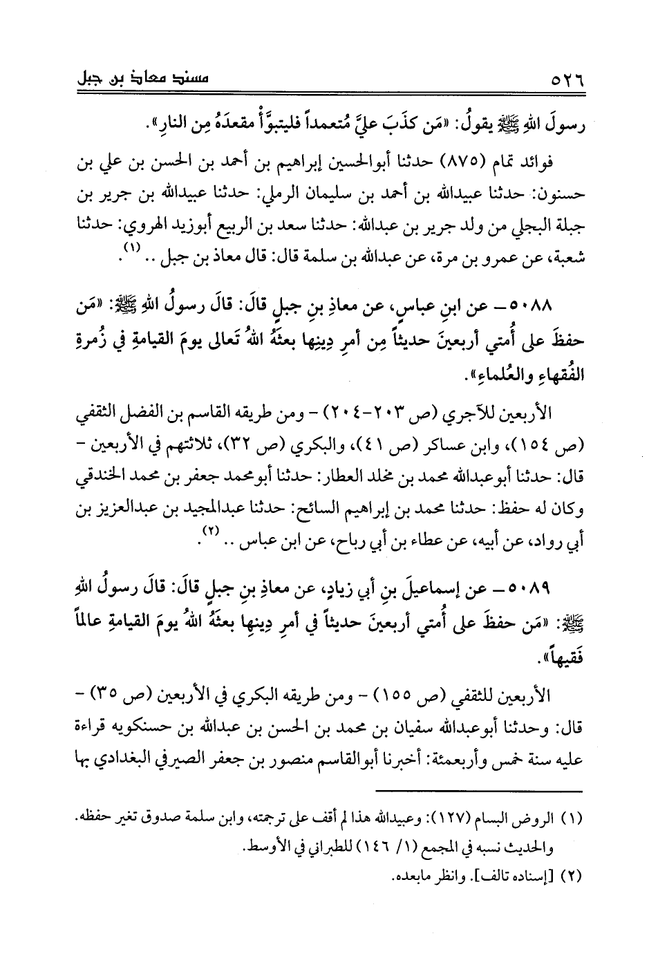 5088 - عن ابنِ عباسٍ، عن معاذِ بنِ جبلٍ قالَ: قالَ رسولُ اللهِ صلى الله عليه وسلم: «مَن حفظَ على أُمتي أربعينَ حديثاً مِن أمرِ دِينِها بعثَهُ اللهُ تَعالى يومَ القيامةِ في زُمرةِ الفُقهاءِ والعُلماءِ».