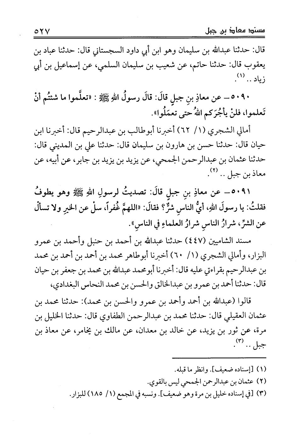 قالوا (عبدالله بن أحمد وأحمد بن عمرو والحسن بن محمد): حدثنا محمد بن عثمان العقيلي قال: حدثنا محمد بن عبدالرحمن الطفاوي قال: حدثنا الخليل بن مرة، عن ثور بن يزيد، عن خالد بن معدان، عن مالك بن يخامر، عن معاذ بن جبل .. (¬3).