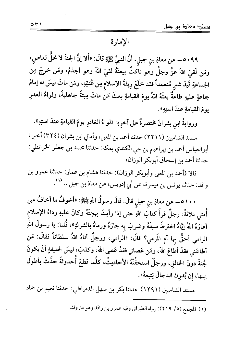 قالا (أحمد بن المعلى وأبوبكر الوزان): حدثنا هشام بن عمار: حدثنا عمرو بن واقد: حدثنا يونس بن ميسرة، عن أبي إدريس، عن معاذ بن جبل .. (¬1).