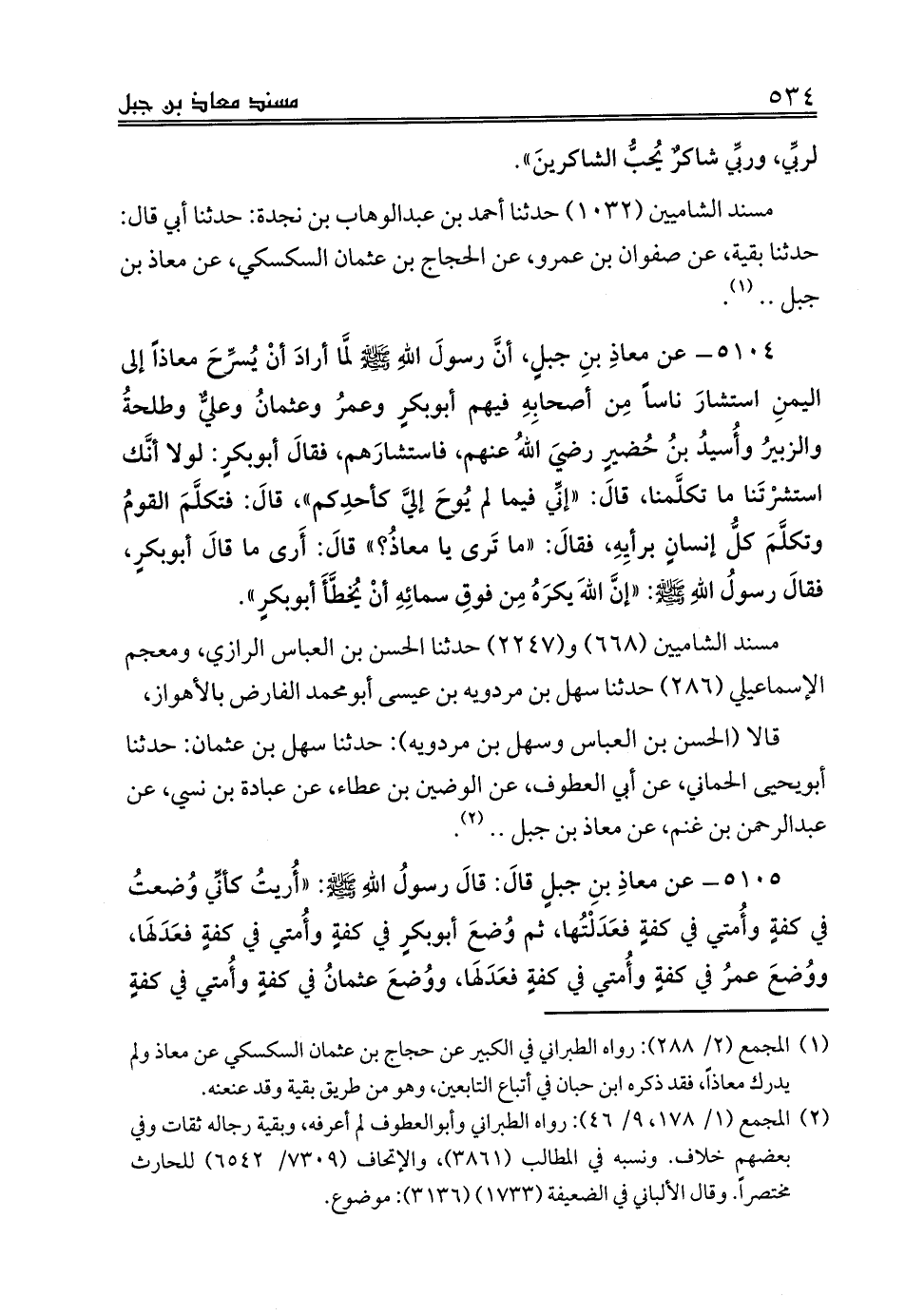 (¬1) المجمع (2/ 288): رواه الطبراني في الكبير عن حجاج بن عثمان السكسكي عن معاذ ولم يدرك معاذاً، فقد ذكره ابن حبان في أتباع التابعين، وهو من طريق بقية وقد عنعنه.
