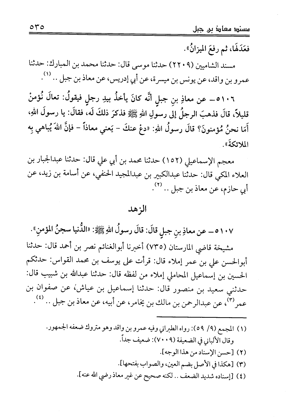 مشيخة قاضي المارستان (735) أخبرنا أبوالغنائم نصر بن أحمد قال: حدثنا أبوالحسن علي بن عمر إملاء قال: قرأت على يوسف بن محمد القواس: حدثكم الحسين بن إسماعيل المحاملي إملاء من لفظه قال: حدثنا عبدالله بن شبيب قال: حدثني سعيد بن منصور قال: حدثنا إسماعيل بن عياش، عن صفوان بن عمر، عن عبدالرحمن بن مالك بن يخامر، عن أبيه، عن معاذ بن جبل .. (¬3).
