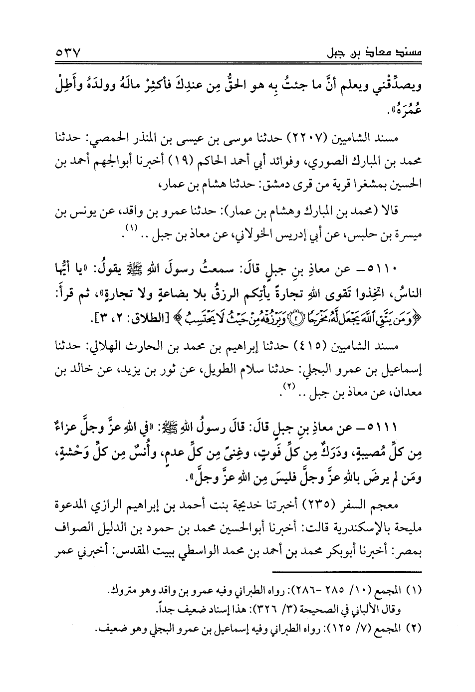 قالا (محمد بن المبارك وهشام بن عمار): حدثنا عمرو بن واقد، عن يونس بن ميسرة بن حلبس، عن أبي إدريس الخولاني، عن معاذ بن جبل .. (¬1).