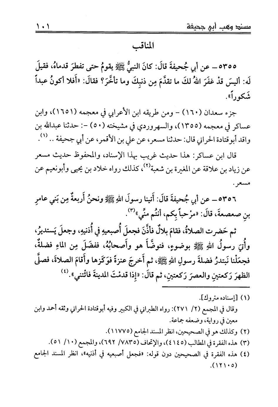 5355 - عن أبي جُحيفةَ قالَ: كانَ النبيُّ صلى الله عليه وسلم يقومُ حتى تفطرَ قدماهُ، فقيلَ لَه: أليسَ قدْ غفَرَ اللهُ لكَ ما تقدَّمَ مِن ذنبِكَ وما تأخَّرَ؟ فقالَ: «أَفلا أكونُ عبداً شَكوراً».