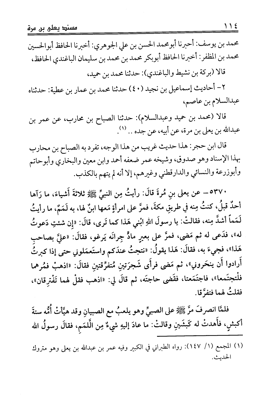 قالا (محمد بن حميد وعبدالسلام): حدثنا الصباح بن محارب، عن عمر بن عبدالله بن يعلى بن مرة، عن أبيه، عن جده .. (¬1).