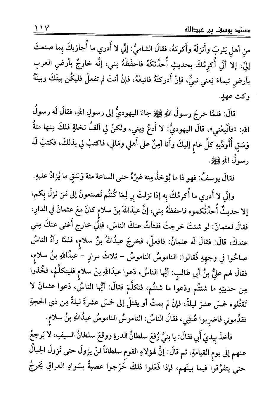 وإنِّي لا أَدري ما أُكرمُكَ بِه إذا نزلتَ بِي لِمَا كُنتُم تَصنعونَ إلى مَن نزلَ بِكم، إلا حديثٌ أُحدِّثُكموه فاحفظْهُ مِني، إنَّ عبدَاللهَ بنَ سلامٍ كانَ معَ عثمانَ في الدارِ، فقالَ لعثمانَ: لو شئتَ خرجتُ ففثأتُ عنكَ الناسَ، فإنِّي خارج أَغنى عنكَ مِني عندكَ، قالَ: فقالَ لَه عثمانُ: فافعلْ، فخرجَ عبدُاللهُ بنُ سلامٍ، فلمَّا رآهُ الناسُ صاحُوا في وجهِهِ فَقالوا: الناموسُ الناموسُ - ثلاثَ مرارٍ - عبدُاللهِ بنُ سلامٍ، فقالَ لهم عليُّ بنُ أبي طالبٍ: أيُّها الناسُ، دَعوا عبدَاللهِ بنَ سلامٍ فليتكلَّمْ، فخُذوا مِن حديثِهِ ما شئتُم ودَعوا ما شئتُم، فتكلَّمَ فقالَ: أيُّها الناسُ، دَعوا عثمانَ لا تَقتُلوه خمسَ عشرَ ليلةً، فإنْ لم يمتْ أو يقتلْ إلى خمسَ عشرةَ ليلةً مِن ذي الحجةِ فقدِّموني فاضرِبوا عُنقِي، فقالَ الناسُ: الناموسُ الناموسُ عبدُاللهِ بنُ سلامٍ.