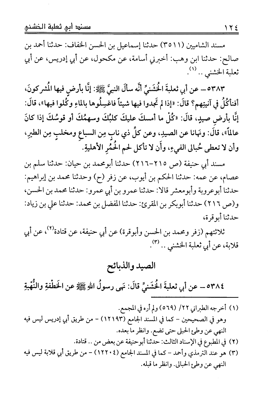 ثلاثتهم (زفر ومحمد بن الحسن وأبوقرة) عن أبي حنيفة، عن قتادة (¬2)، عن أبي قلابة، عن أبي ثعلبة الخشني .. (¬3).