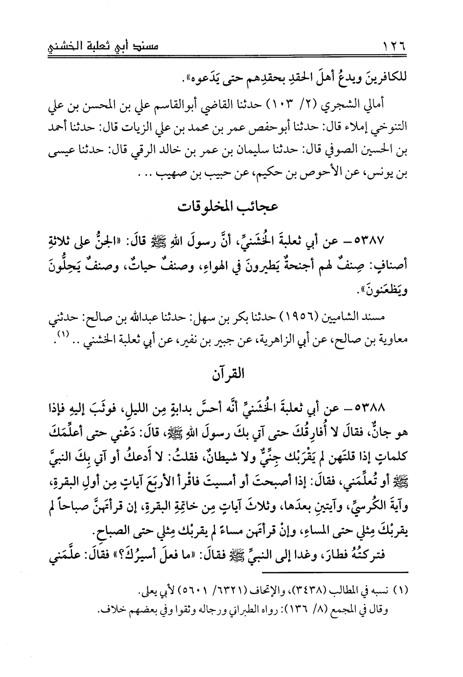 5388 - عن أبي ثعلبةَ الخُشَنيِّ أنَّه أحسَّ بدابةٍ مِن الليلِ، فوثَبَ إليهِ فإذا هو جانٌّ، فقالَ لا أُفارِقُكَ حتى آتي بكَ رسولَ اللهِ صلى الله عليه وسلم، قالَ: دَعْني حتى أعلِّمَكَ كلماتٍ إذا قلتَهن لم يَقْرَبْك جِنِّيٌّ ولا شيطانٌ، فقلتُ: لا أَدعكُ أو آتي بِكَ النبيَّ صلى الله عليه وسلم أو تُعلِّمَني، فقالَ: إذا أصبحتَ أو أمسيتَ فاقْرأ الأربَعِ آياتٍ مِن أولِ البقرةِ، وآيةَ الكُرسيِّ، وآيتينِ بعدَها، وثلاثَ آياتٍ مِن خاتِمةِ البقرةِ، إن قرأتَهنَّ صباحاً لم يقربْكَ مِثلي حتى المساءِ، وإنْ قرأتَهن مساءً لم يقربْك مِثلي حتى الصباحِ.