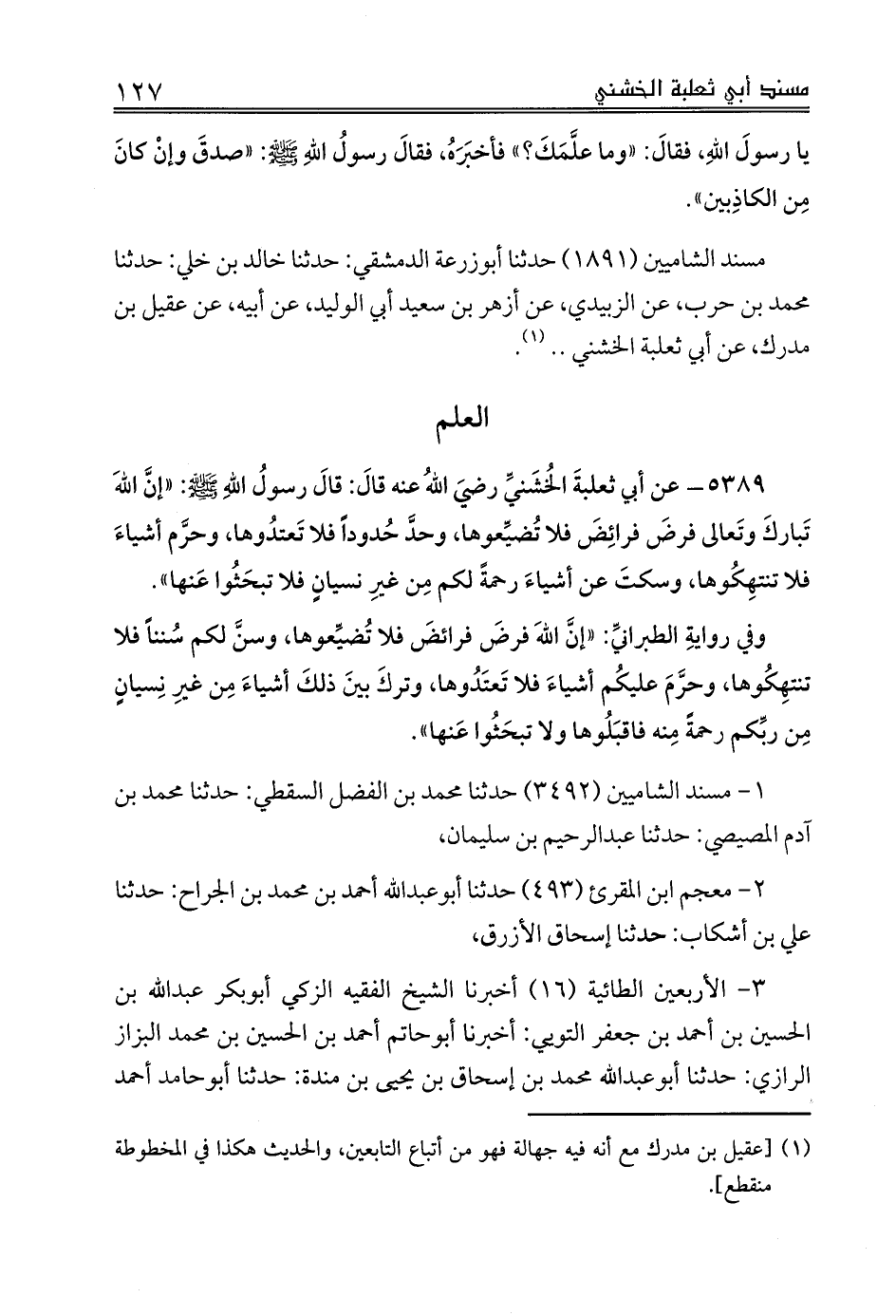 مسند الشاميين (1891) حدثنا أبوزرعة الدمشقي: حدثنا خالد بن خلي: حدثنا محمد بن حرب، عن الزبيدي، عن أزهر بن سعيد أبي الوليد، عن أبيه، عن عقيل بن مدرك، عن أبي ثعلبة الخشني .. (¬1).