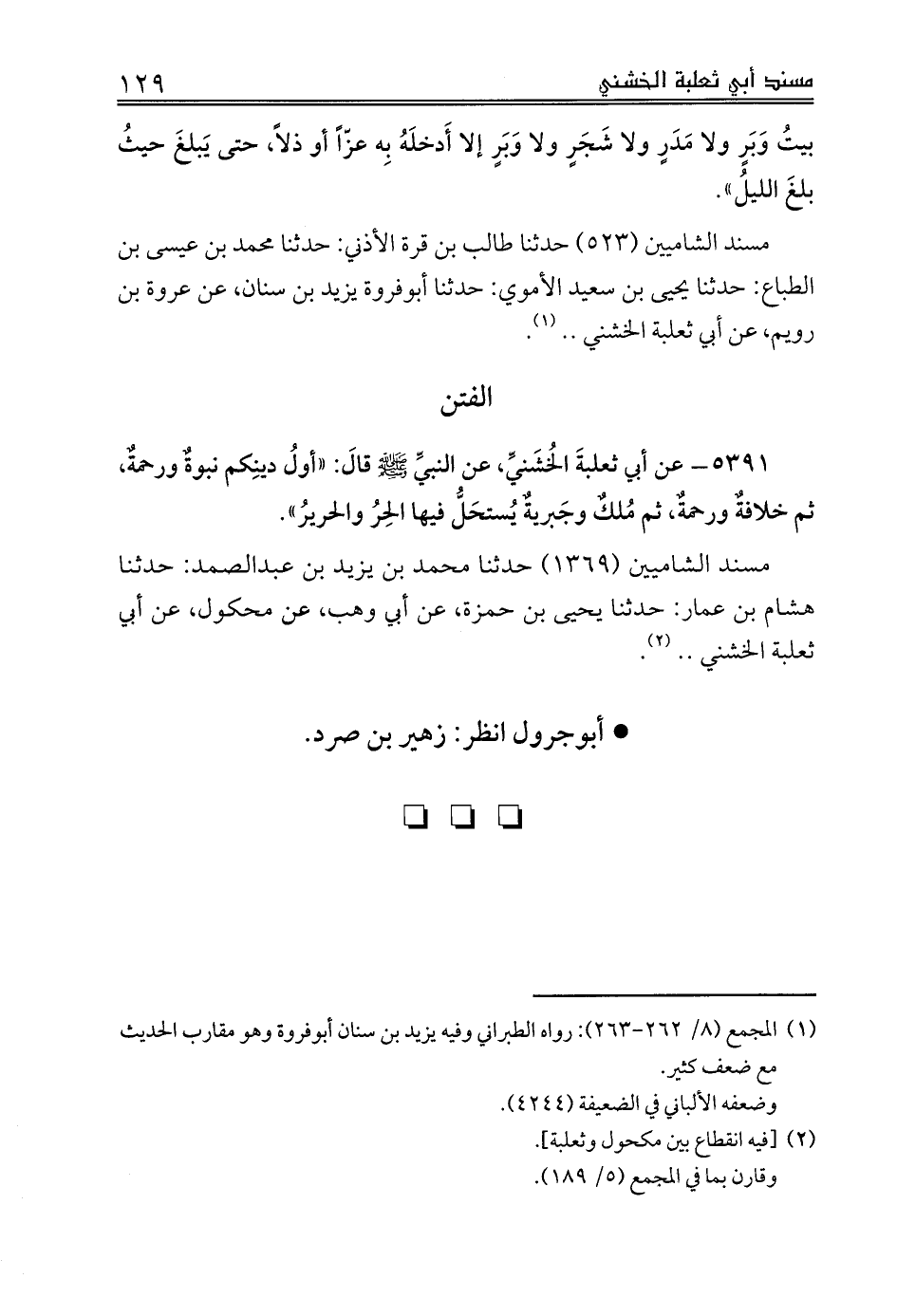 مسند الشاميين (523) حدثنا طالب بن قرة الأذني: حدثنا محمد بن عيسى بن الطباع: حدثنا يحيى بن سعيد الأموي: حدثنا أبوفروة يزيد بن سنان، عن عروة بن رويم، عن أبي ثعلبة الخشني .. (¬1).