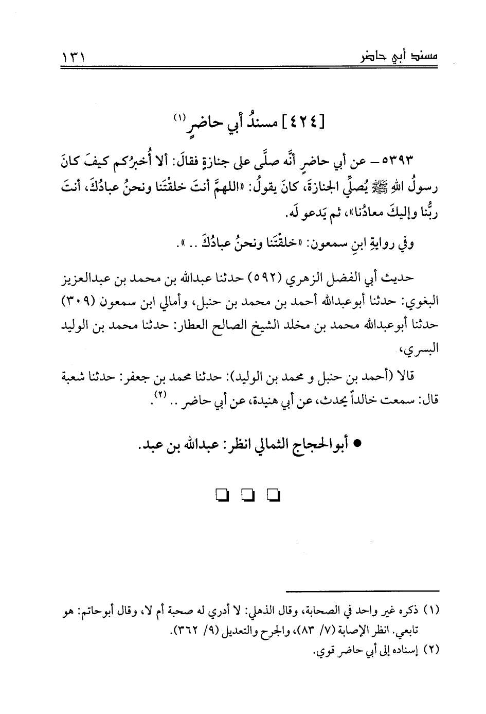 قالا (أحمد بن حنبل و محمد بن الوليد): حدثنا محمد بن جعفر: حدثنا شعبة قال: سمعت خالداً يحدث، عن أبي هنيدة، عن أبي حاضر .. (¬2).