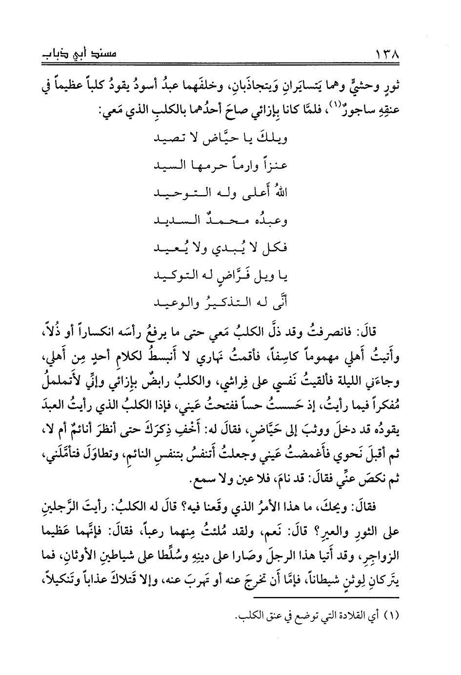 ثورٍ وحشيٍّ وهما يَتسايَرانِ وَيتجاذَبانِ، وخلفَهما عبدُ أسودُ يقودُ كلباً عظيماً في عنقِهِ ساجورٌ (¬1)، فلمَّا كانا بِإزائي صاحَ أحدُهما بالكلبِ الذي مَعي: