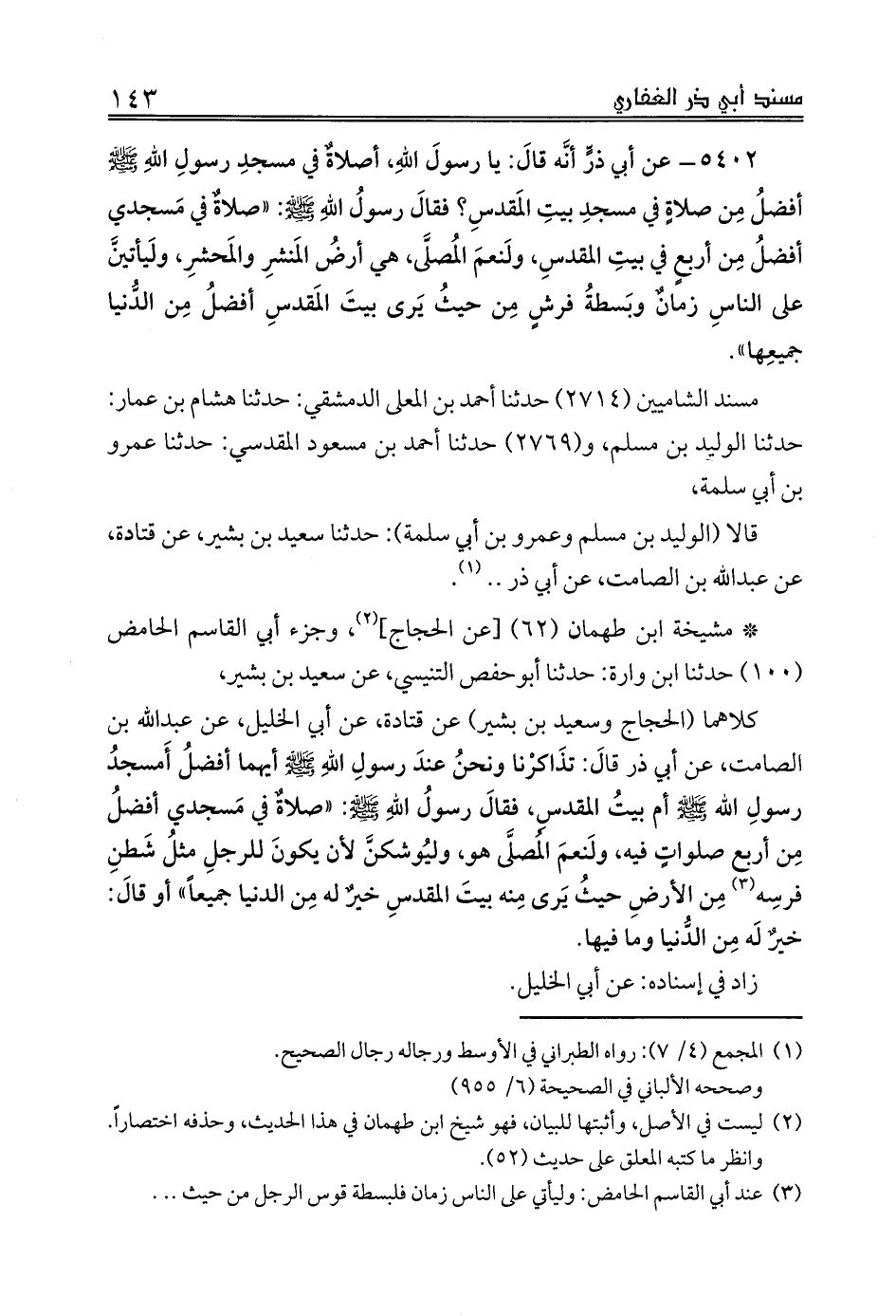 5402 - عن أبي ذرٍّ أنَّه قالَ: يا رسولَ اللهِ، أصلاةٌ في مسجدِ رسولِ اللهِ صلى الله عليه وسلم أفضلُ مِن صلاةٍ في مسجدِ بيتِ المَقدسِ؟ فقالَ رسولُ اللهِ صلى الله عليه وسلم: «صلاةٌ في مَسجدي أفضلُ مِن أربعٍ في بيتِ المقدسِ، ولَنعمَ المُصلَّى، هي أرضُ المَنشرِ والمَحشرِ، ولَيأتينَّ على الناسِ زمانٌ وبَسطةُ فرشٍ مِن حيثُ يَرى بيتَ المَقدسِ أفضلُ مِن الدُّنيا جميعِها».