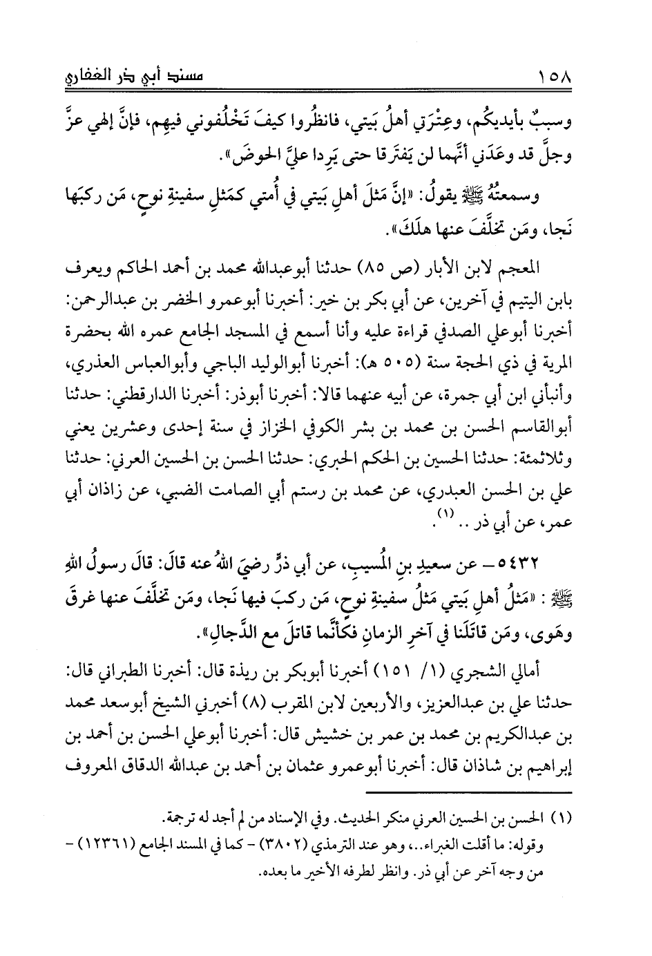 5432 - عن سعيدِ بنِ المُسيبِ، عن أبي ذرٍّ رضيَ اللهُ عنه قالَ: قالَ رسولُ اللهِ صلى الله عليه وسلم: «مَثلُ أهلِ بَيتي مَثلُ سفينةِ نوحٍ، مَن ركبَ فيها نَجا، ومَن تخلَّفَ عنها غرقَ وهَوى، ومَن قاتَلَنا في آخرِ الزمانِ فكأنَّما قاتلَ مع الدَّجالِ».