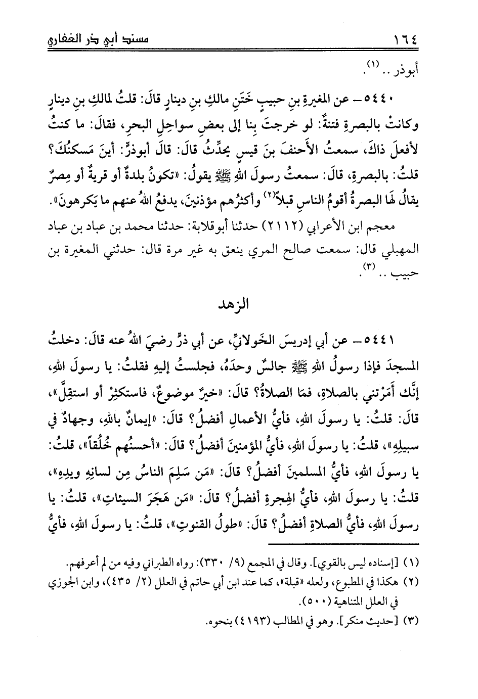 5440 - عن المغيرةِ بنِ حبيبٍ خَتَنِ مالكِ بنِ دينارٍ قالَ: قلتُ لمالكِ بنِ دينارٍ وكانتْ بالبصرةِ فتنةٌ: لو خرجتَ بِنا إلى بعضِ سواحِلِ البحرِ، فقالَ: ما كنتُ لأفعلَ ذاكَ، سمعتُ الأَحنفَ بنَ قيسٍ يحدِّثُ قالَ: قالَ أبوذرٍّ: أينَ مَسكنُكَ؟ قلتُ: بالبصرةِ، قالَ: سمعتُ رسولَ اللهِ صلى الله عليه وسلم يقولُ: «تكونُ بلدةٌ أو قريةٌ أو مِصرٌ يقالُ لَها البصرةُ أقومُ الناسِ قبلاً (¬2) وأكثرُهم مؤذنينَ، يدفعُ اللهُ عنهم ما يَكرهونَ».