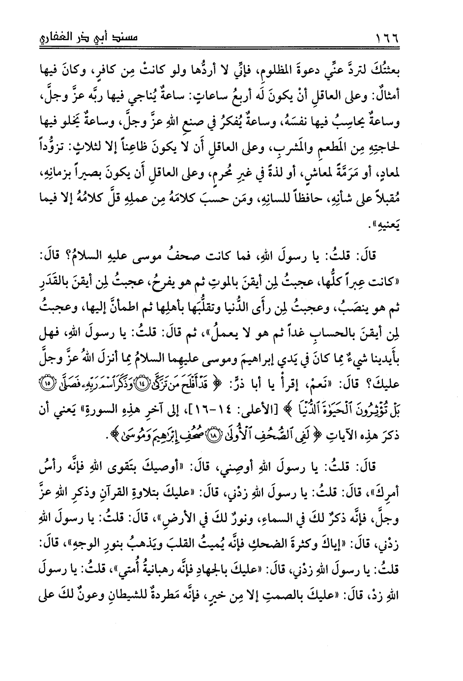قالَ: قلتُ: يا رسولَ اللهِ، فما كانت صحفُ موسى عليهِ السلامُ؟ قالَ: «كانت عِبراً كلُّها، عجبتُ لِمن أيقنَ بالموتِ ثم هو يفرحُ، عجبتُ لِمن أيقنَ بالقَدَرِ ثم هو ينصَبُ، وعجبتُ لِمن رأَى الدُّنيا وتقلُّبَها بأهلِها ثم اطمأنَّ إليها، وعجبتُ لِمن أيقنَ بالحسابِ غداً ثم هو لا يعملُ»، ثم قالَ: قلتُ: يا رسولَ اللهِ، فهل بأَيدينا شيءٌ مِما كانَ في يَدي إبراهيمَ وموسى عليهِما السلامُ مِما أنزلَ اللهُ عزَّ وجلَّ عليكَ؟ قالَ: «نَعمْ، إقرأْ يا أبا ذرٍّ: {قَدْ أَفْلَحَ مَنْ تَزَكَّى (14) وَذَكَرَ اسْمَ رَبِّهِ فَصَلَّى (15) بَلْ تُؤْثِرُونَ الْحَيَاةَ الدُّنْيَا} [الأعلى: 14 - 16]، إلى آخرِ هذِهِ السورةِ» يَعني أنَّ ذكرَ هذِه الآياتِ {لَفِي الصُّحُفِ الْأُولَى (18) صُحُفِ إِبْرَاهِيمَ وَمُوسَى}.
