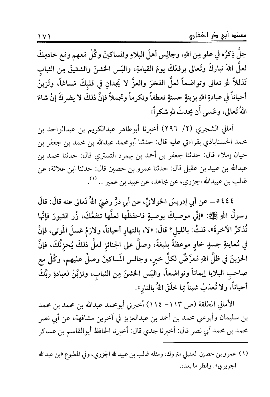 5444 - عن أبي إدريسَ الخولانيِّ، عن أبي ذرٍّ رضيَ اللهُ تَعالى عنه قالَ: قالَ رسولُ اللهِ صلى الله عليه وسلم: «إنِّي موصيكَ بوصيةٍ فاحفظْها لعلَّها تنفعُكَ، زُر القبورَ فإنَّها تُذكرُ الآخرةَ»، قلتُ: بالليلِ؟ قالَ: «لا، بالنهارِ أحياناً، ولازمْ غسلَ المَوتى، فإنَّ في مُعاينةِ جسدٍ خاوٍ موعظةً بليغةً، وصلِّ على الجنائزِ لعلَّ ذلكَ يُحزِنُكَ، فإنَّ الحزينَ في ظلِّ اللهِ مُعرَّضٌ لكلِّ خيرٍ، وجالس المَساكينَ وصلِّ عليهم، وكُلْ مع صاحبِ البلايا إيماناً وتواضعاً، والبَس الخشنَ مِن الثيابِ، وتزيَّنْ لعبادةِ ربِّكَ أحياناً، ولا تُعذبْ شيئاً مِما خلَقَ اللهُ بالنارِ».