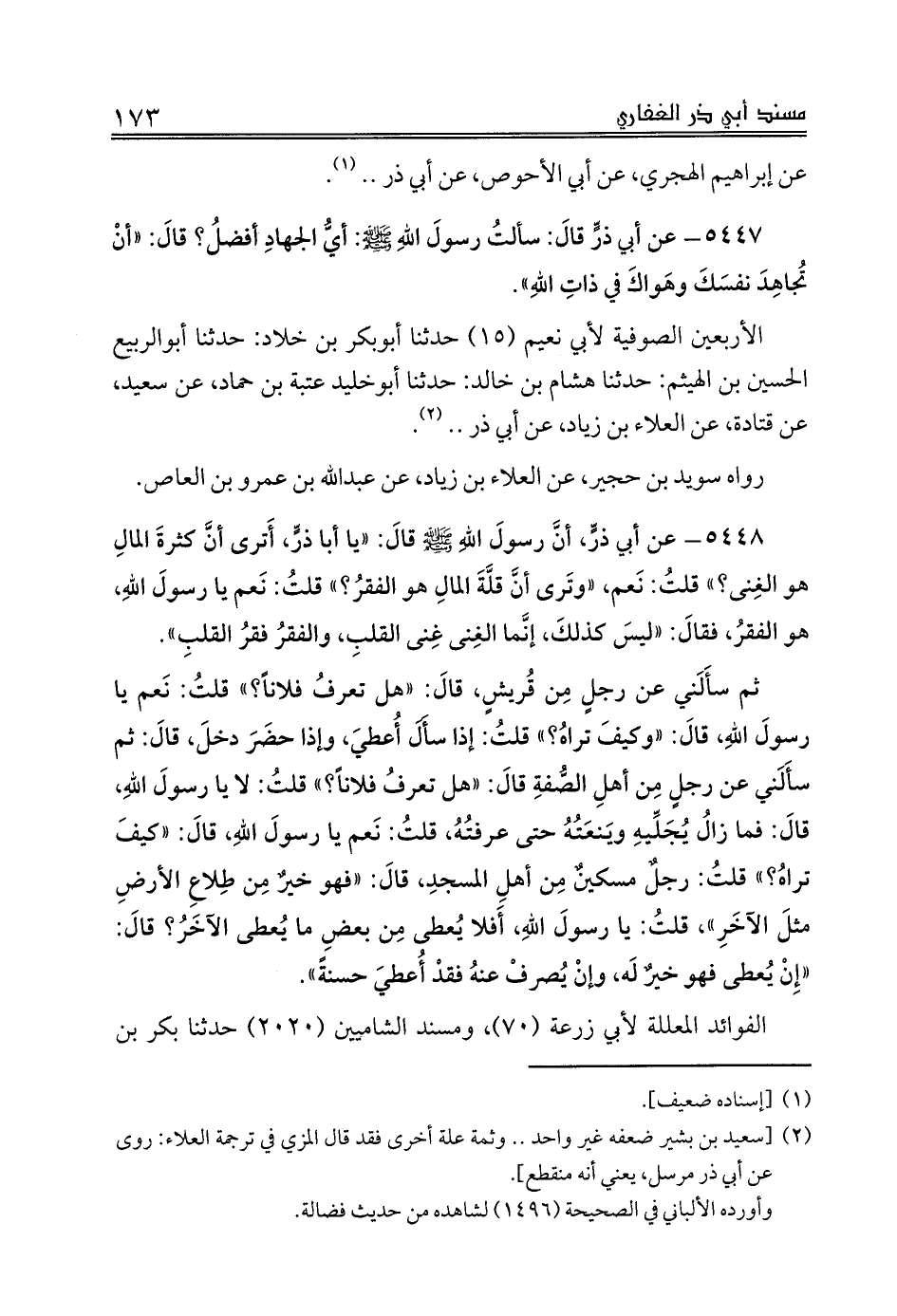 5448 - عن أبي ذرٍّ، أنَّ رسولَ اللهِ صلى الله عليه وسلم قالَ: «يا أبا ذرٍّ، أَترى أنَّ كثرةَ المالِ هو الغِنى؟» قلتُ: نَعم، «وتَرى أنَّ قلَّةَ المالِ هو الفقرُ؟» قلتُ: نَعم يا رسولَ اللهِ، هو الفقرُ، فقالَ: «ليسَ كذلكَ، إنَّما الغِنى غِنى القلبِ، والفقرُ فقرُ القلبِ».