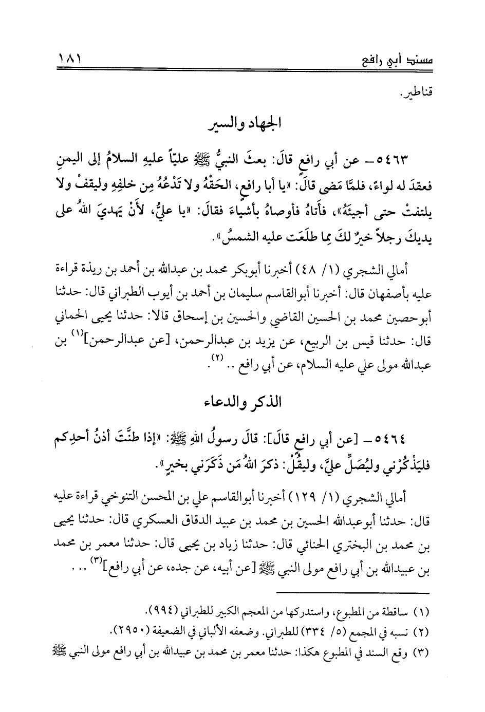 أمالي الشجري (1/ 48) أخبرنا أبوبكر محمد بن عبدالله بن أحمد بن ريذة قراءة عليه بأصفهان قال: أخبرنا أبوالقاسم سليمان بن أحمد بن أيوب الطبراني قال: حدثنا أبوحصين محمد بن الحسين القاضي والحسين بن إسحاق قالا: حدثنا يحيى الحماني قال: حدثنا قيس بن الربيع، عن يزيد بن عبدالرحمن، [عن عبدالرحمن] (¬1) بن عبدالله مولى علي عليه السلام، عن أبي رافع .. (¬2).