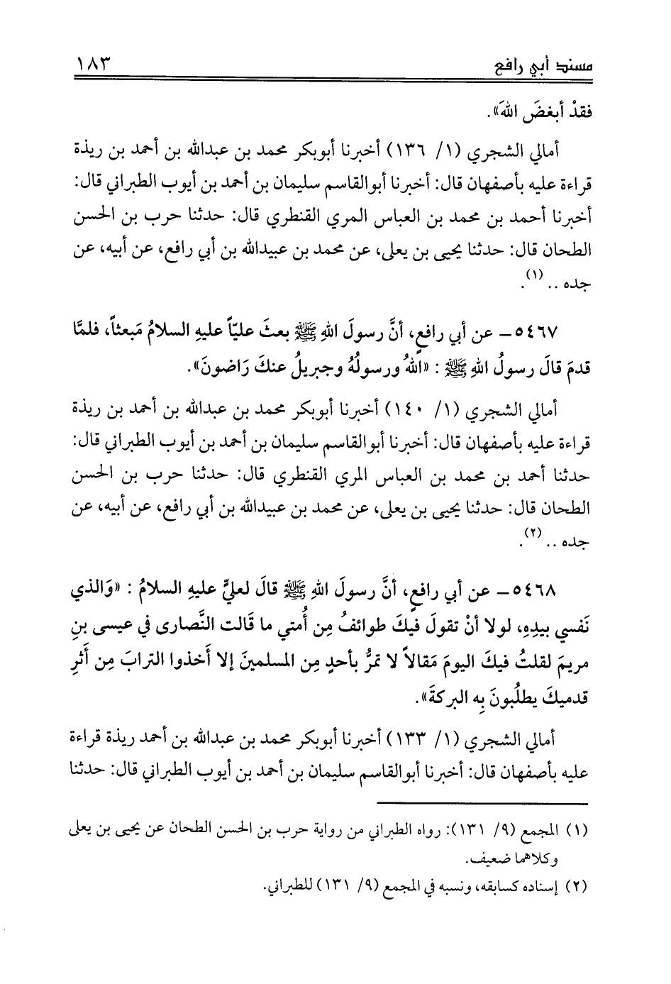 أمالي الشجري (1/ 140) أخبرنا أبوبكر محمد بن عبدالله بن أحمد بن ريذة قراءة عليه بأصفهان قال: أخبرنا أبوالقاسم سليمان بن أحمد بن أيوب الطبراني قال: حدثنا أحمد بن محمد بن العباس المري القنطري قال: حدثنا حرب بن الحسن الطحان قال: حدثنا يحيى بن يعلى، عن محمد بن عبيدالله بن أبي رافع، عن أبيه، عن جده .. (¬2).