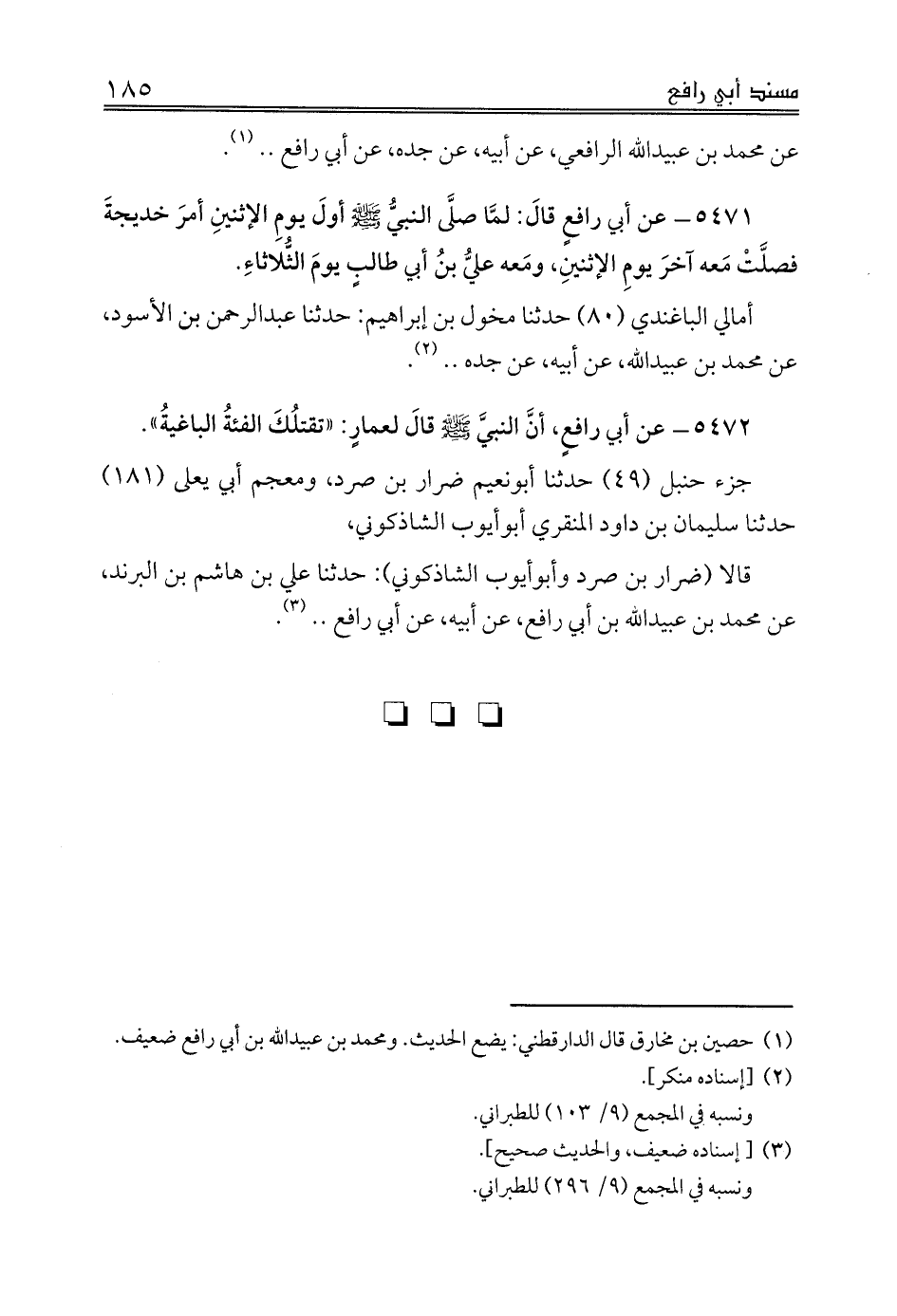 قالا (ضرار بن صرد وأبوأيوب الشاذكوني): حدثنا علي بن هاشم بن البرند، عن محمد بن عبيدالله بن أبي رافع، عن أبيه، عن أبي رافع .. (¬3).