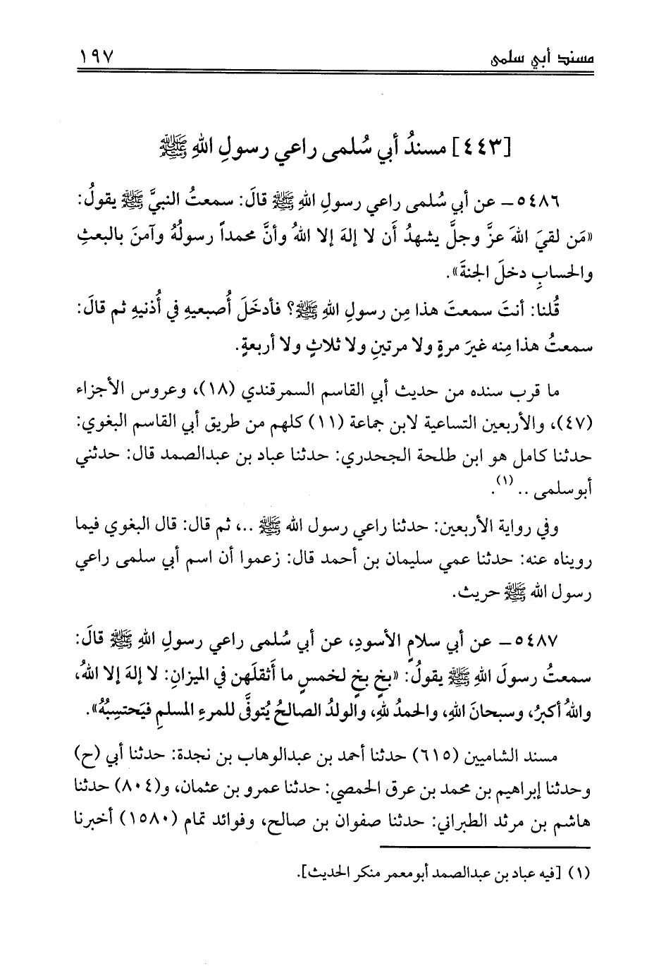 5486 - عن أبي سُلمى راعي رسولِ اللهِ صلى الله عليه وسلم قالَ: سمعتُ النبيَّ صلى الله عليه وسلم يقولُ: «مَن لقيَ اللهَ عزَّ وجلَّ يشهدُ أَن لا إلهَ إلا اللهُ وأنَّ محمداً رسولُهُ وآمنَ بالبعثِ والحسابِ دخلَ الجنةَ».