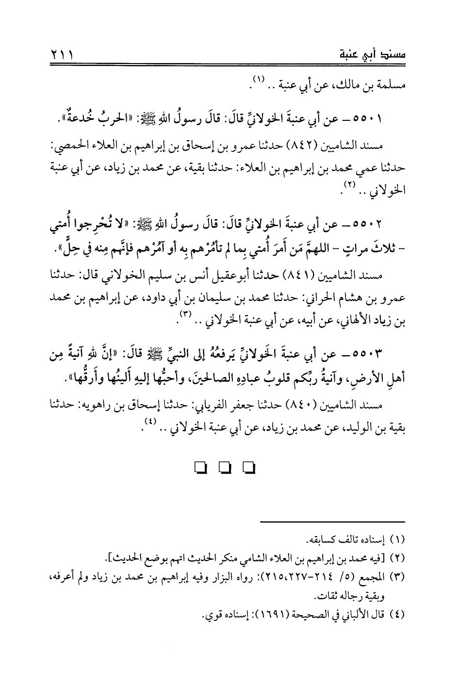 مسند الشاميين (842) حدثنا عمرو بن إسحاق بن إبراهيم بن العلاء الحمصي: حدثنا عمي محمد بن إبراهيم بن العلاء: حدثنا بقية، عن محمد بن زياد، عن أبي عنبة الخولاني .. (¬2).