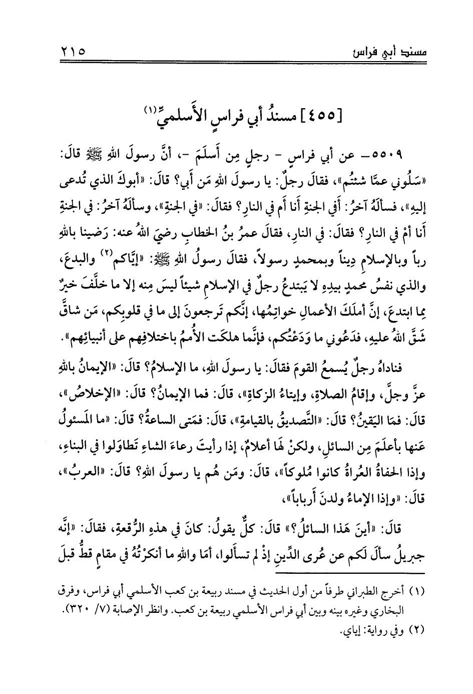 5509 - عن أبي فراسٍ - رجلٍ مِن أَسلَمَ -، أنَّ رسولَ اللهِ صلى الله عليه وسلم قالَ: «سَلُوني عمَّا شئتُم»، فقالَ رجلٌ: يا رسولَ اللهِ مَن أَبي؟ قالَ: «أبوكَ الذي تُدعى إليهِ»، فسألَهُ آخرُ: أَفي الجنةِ أَنا أَم في النارِ؟ فقالَ: «في الجنةِ»، وسألَهُ آخرُ: في الجنةِ أَنا أمْ في النارِ؟ فقالَ: في النارِ، فقالَ عمرُ بنُ الخطابِ رضيَ اللهُ عنه: رَضينا باللهِ رباً وبالإسلامِ دِيناً وبمحمدٍ رسولاً، فقالَ رسولُ اللهِ صلى الله عليه وسلم: «إيَّاكم (¬2) والبدعَ، والذي نفسُ محمدٍ بيدِهِ لا يَبتدعُ رجلٌ في الإسلامِ شيئاً ليسَ مِنه إلا ما خلَّفَ خيرٌ مِما ابتدعَ، إنَّ أملَكَ الأعمالِ خواتِمُها، إنَّكم تَرجعونَ إلى ما في قلوبِكم، مَن شاقَّ شَقَّ اللهُ عليهِ، فدَعُوني ما وَدَعْتُكم، فإنَّما هلكَت الأُممُ باختلافِهم على أنبيائِهم».