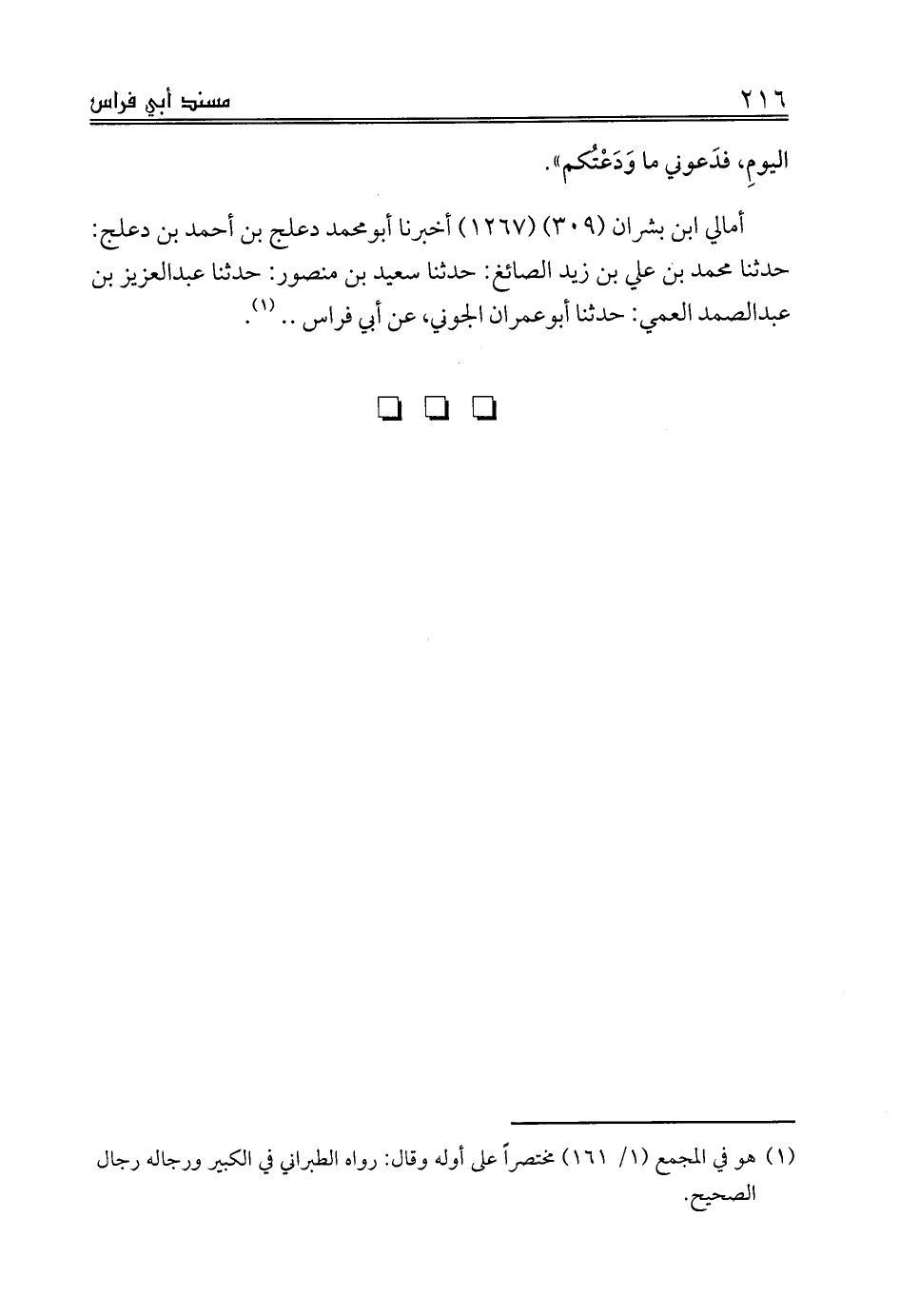 أمالي ابن بشران (309) (1267) أخبرنا أبومحمد دعلج بن أحمد بن دعلج: حدثنا محمد بن علي بن زيد الصائغ: حدثنا سعيد بن منصور: حدثنا عبدالعزيز بن عبدالصمد العمي: حدثنا أبوعمران الجوني، عن أبي فراس .. (¬1).