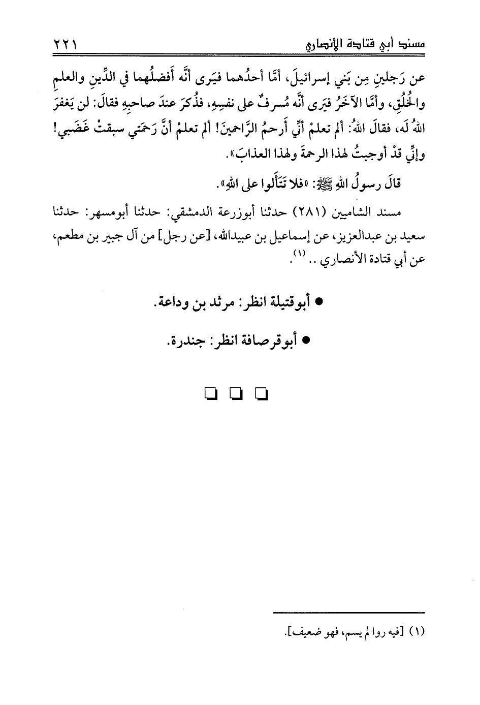 مسند الشاميين (281) حدثنا أبوزرعة الدمشقي: حدثنا أبومسهر: حدثنا سعيد بن عبدالعزيز، عن إسماعيل بن عبيدالله، [عن رجل] من آل جبير بن مطعم، عن أبي قتادة الأنصاري .. (¬1).