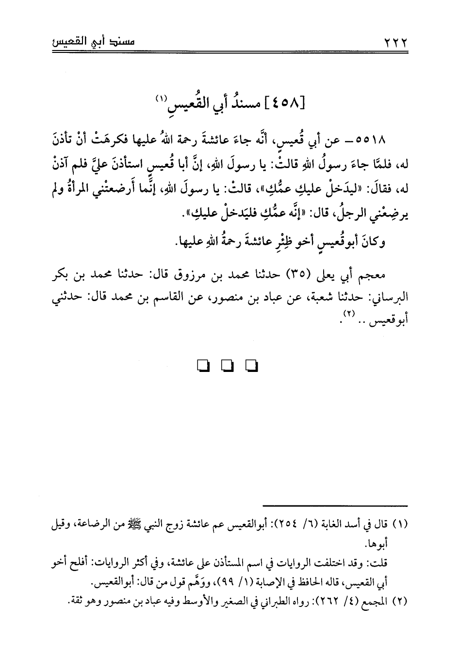 (¬1) قال في أسد الغابة (6/ 254): أبوالقعيس عم عائشة زوج النبي صلى الله عليه وسلم من الرضاعة، وقيل أبوها.