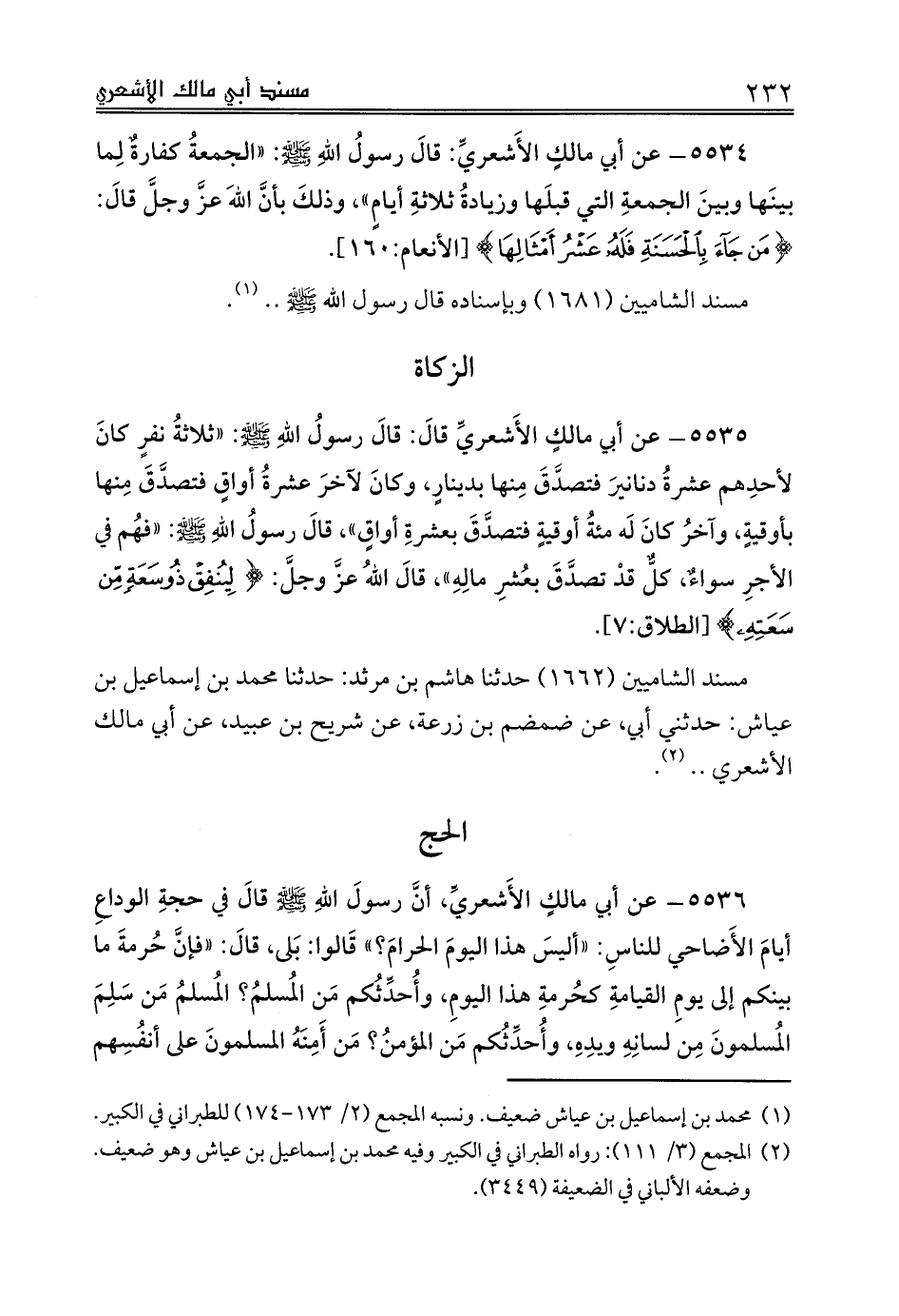 مسند الشاميين (1662) حدثنا هاشم بن مرثد: حدثنا محمد بن إسماعيل بن عياش: حدثني أبي، عن ضمضم بن زرعة، عن شريح بن عبيد، عن أبي مالك الأشعري .. (¬2).