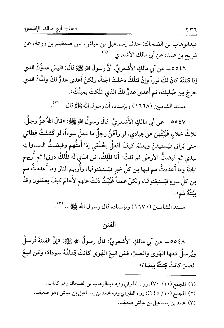 عبدالوهاب بن الضحاك: حدثنا إسماعيل بن عياش، عن ضمضم بن زرعة، عن شريح بن عبيد، عن أبي مالك الأشعري .. (¬1).